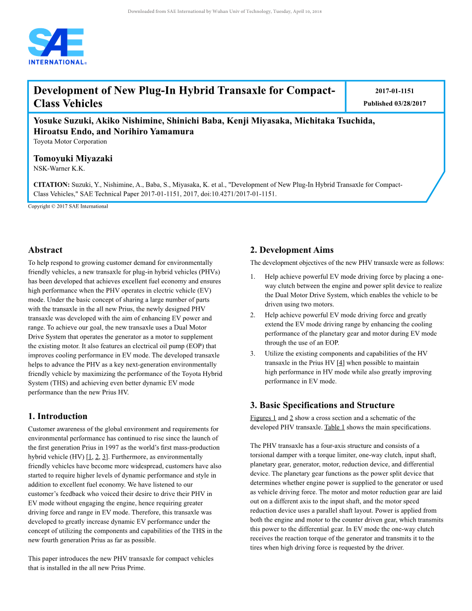 本文介绍了一种用于小型车辆的新型PHV变速驱动桥。 双电机驱动系统的采用以及行星齿轮和电机的冷却性能的增强有助于提高电动汽车在EV模式下的性能。 EV模式下性能的改善使新PHV能够在比以前的PHV更多的行驶条件下保持发动机熄火。 PHV是新一代重要的环保型车辆,采用这种新型驱动桥将有助于向全球所有人展示PHV性能和效率的新水平。
