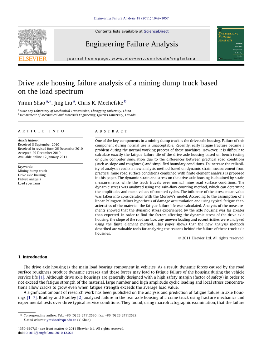 本文重点研究了一种基于实际矿山路面状况的动态应变测量与有限元分析相结合的矿用自卸车驱动桥壳故障分析方法。故障类型是通过断面分析确定的。在这种情况下使用的驱动桥壳体的疲劳寿命是基于通过对实际矿山路面轮廓的测试测量的动态应力并且使用线性PalmgrenMiner损伤累积假设的假设来预测的。使用材料的正常疲劳特性。使用基于有限元的方法研究了壳体