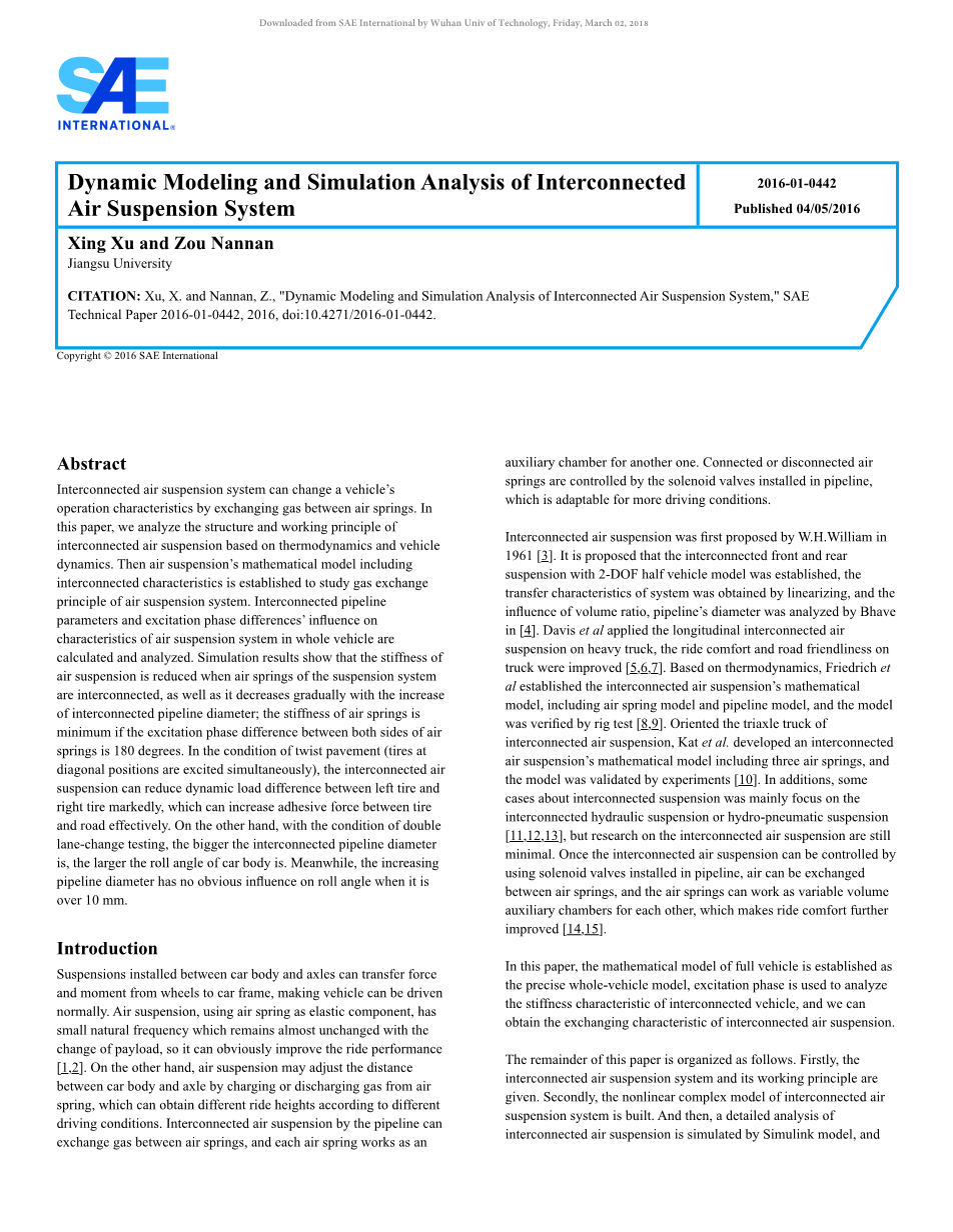 互连空气悬架系统可以通过在空气弹簧间交换空气来改变汽车的操纵稳定性。本文中,基于热力学和车辆动力学分析互连空气悬架的结构和工作原理。然后空气悬架的数学模型(包括互联特性)被建立用来研究空气悬架系统的空气交换原理。互连管道和激励相位差对整车空气悬架系统的特点被计算和分析。仿真结果显示当悬架系统中的空气弹簧互连时,空气弹簧的刚度减小。同时随着相互连接的管道直径增大,刚度逐渐减小。如果空气弹簧两侧的激励相位差是180度,此时空气弹簧刚度最小。在扭曲路面工况时(即处于对角的轮胎被同时激发),互连空气悬架可以明显减少左轮胎和右轮胎之间的动态载荷差,这可以有效增加轮胎和路面之间的附着力。另一方面,在双车道变换测试工况下,相互连接的管道直径越大,车身侧倾角越大。同时,增加的管线直径对等角10mm时的侧倾角没有明显影响。