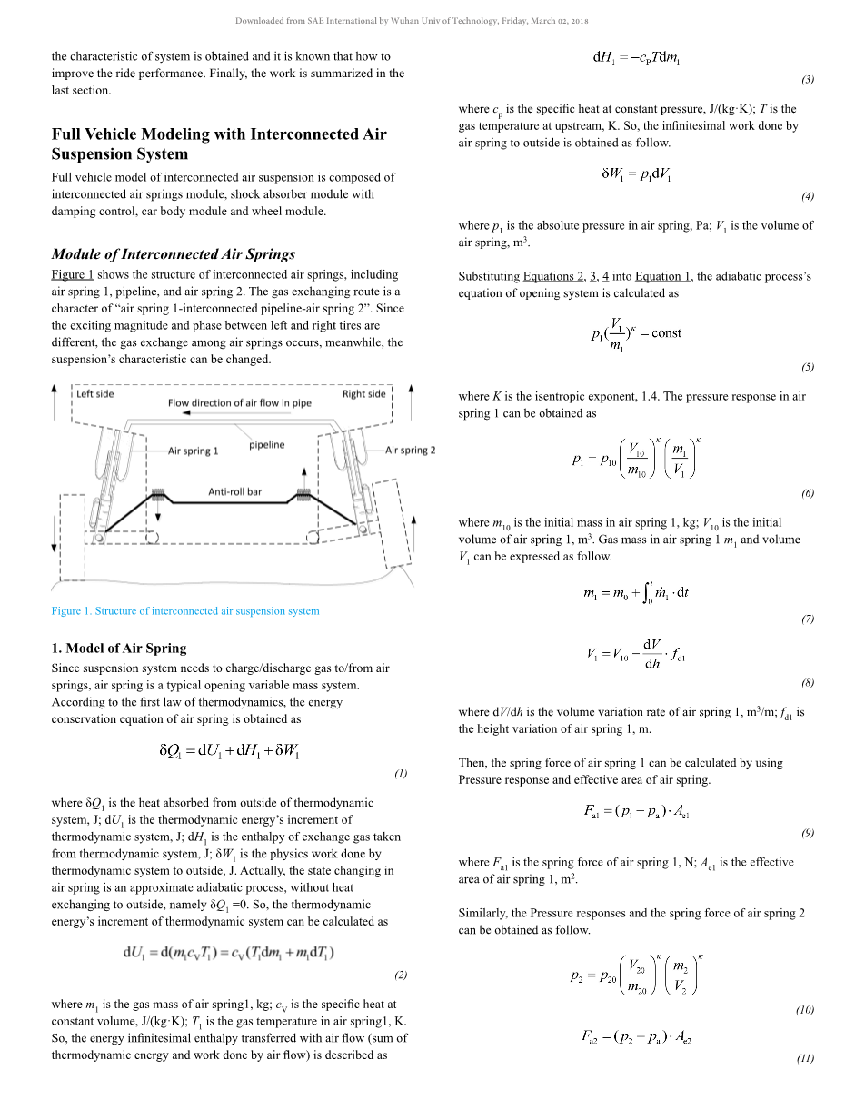 其中是空气弹簧1的气体质量,kg;是恒定体积比热,J /(kg·K);是空气弹簧1中的气体温度,K。因此,随着空气流动而传递的能量无穷小焓(热力学能量和空气流动完成的功的总和)被描述为: (3)