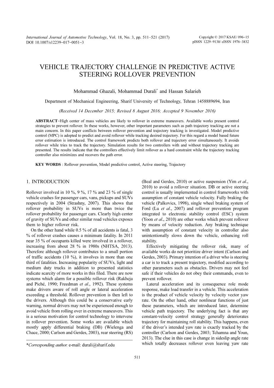 2004年轿车,货车,皮卡和SUV的单次车辆碰撞分别占10%,9%,17%和23%(Strashny,2007)。这表明SUV的翻转概率是乘用车翻滚概率的两倍以上。 SUV和其他类似道路车辆的重心明显较高,使其承受较高的翻车风险。另一方面,虽然所有事故中有0.5%是致命的,但3%的翻车事故造成的死亡率最低。 2011年,近35%的遇难者参与翻车,从20世纪80年代的约28%增加(NHTSA,2013)。因此,虽然翻车事故导致一小部分交通事故(10%),但其中涉及三分之一以上的死亡事故。除了呈现的统计数字外,越来越多的SUV,轻型和中型卡车也越来越受欢迎,这表明该领域的更多作品缺乏。现在有系统报警可能存在翻滚风险(Rakheja和Picheacute;,1990; Freedman等,1992)。这些系统使驾驶员意识到侧倾角或横向加速度超过阈值。翻车预防留给司机。尽管这可能是一个保守的预警,但是普通驾驶员可能没有足够的经验来避免车辆在极端机动中翻滚。这是控制技术介入防止翻滚的严重动机。有些作品主要应用差速制动(DB)(Wielenga和Chace,2000; Carlson和Gerdes,2003),后轮转向(RS)(Beal和Gerdes,2010)或主动中止(Yim等,2010)以避免翻转情况。数据库或主动转向控制通常在控制框架中采用恒定车速的假设。福特的单轮制动系统(Lu et al。,2007)和整合到电子稳定控制(ESC)系统(Yoon等人,2010)的防翻转程序是其他一些可以防止车辆发生故障的工程(Palkovics,1998)通过减速进行翻滚。在控制器中假设速度恒定的任何制动技术也会无意中减慢车辆速度,从而增强侧倾稳定性。有效地减轻翻车风险,许多现有的作品没有优先考虑驾驶员意图(Carlson and Gerdes,2003)。驾驶汽车的驾驶员的主要意图是跟踪当前的轨迹,根据诸如障碍物之类的其他参数进行修改。如果他们的车辆不遵守他们的命令,驾驶员可能不会感到安全,甚至可以防止翻车。