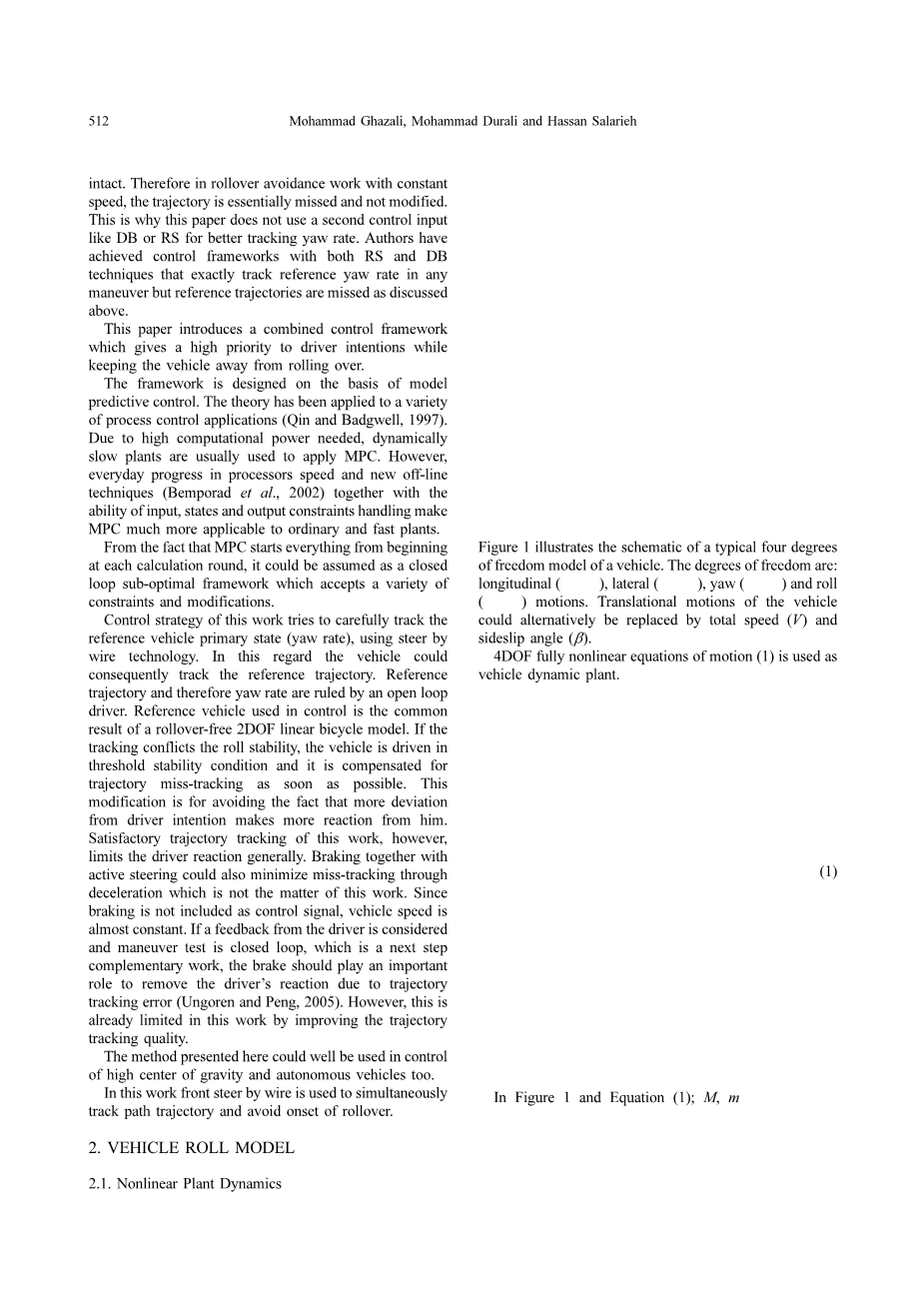 本文介绍了一个综合控制框架,在驾驶员意图较高的同时保持车辆远离翻车。该框架是在模型预测控制的基础上设计的。该理论已被应用于各种过程控制应用(Qin和Badgwell,1997)。由于需要高计算能力,动态缓慢的设备通常用于应用MPC。然而,处理器速度和新的离线技术(Bemporad等,2002)的日常进步以及输入,状态和输出约束处理的能力使MPC更适用于普通和快速的工厂。从每次计算开始MPC开始的一切事实来看,它可以被认为是一个闭环次优框架,它接受各种约束和修改。