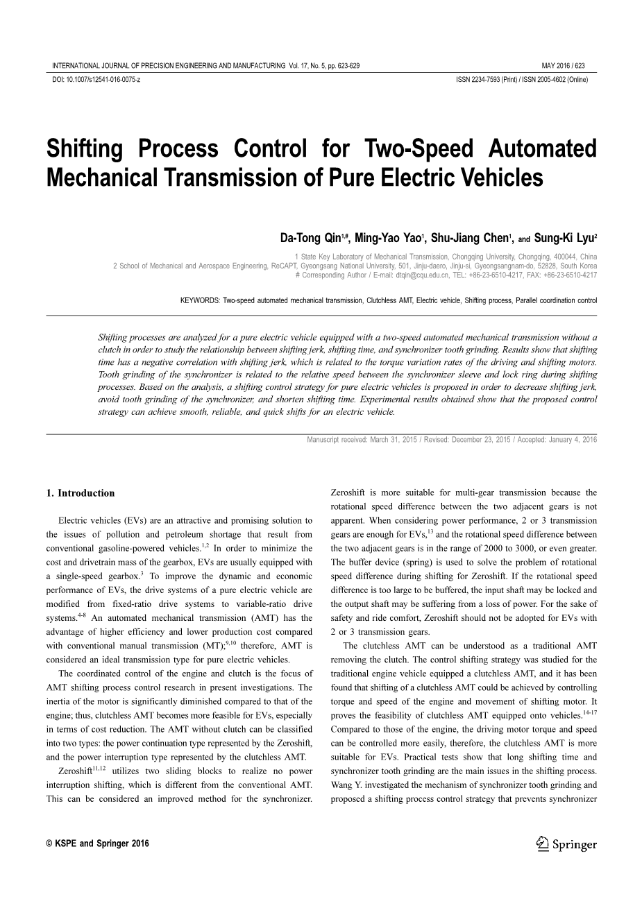 摘要:为了研究换挡冲击、换挡时间和同步器磨齿之间的关系,本文分析了装备有无离合器的双速自动机械变速器的纯电动机车辆的换挡过程。分析结果表明,换挡时间与换挡冲击成反比,换挡冲击与驱动换挡电机的扭矩变化率有关。同步器的磨齿与换挡过程中同步器套筒与锁定环之间的相对速度有关。在此基础上,本文提出了纯电动汽车的换挡控制策略,以减少换挡冲击,避免同步器磨齿现象,缩短换挡时间。实验结果表明,本文所提出的控制策略可以实现电动车辆的平稳性、可靠性以及换挡的迅速性。