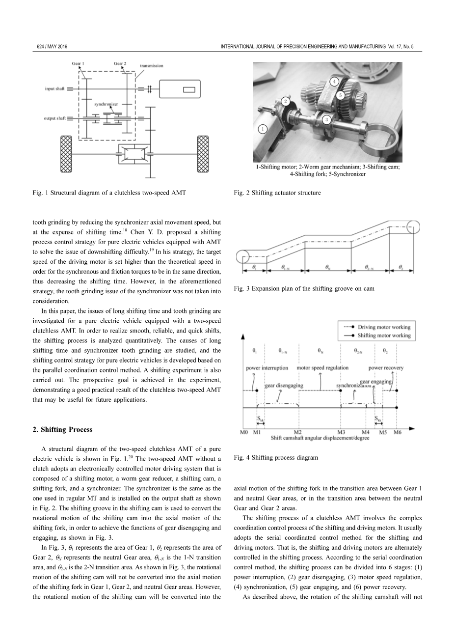 无离合器的自动机械式变速器可以理解为传动的自动机械式变速器去掉变速箱。本文研究了配备无离合器的自动机械式变速器的传统引擎车辆的控制换挡策略,并且发现通过控制发动机的转矩和速度以及换挡电动机的运行可实现无离合器自动机械式变速器的换挡。这证明了将无离合器的AMT装备在车辆上的可行性。与发动机相比,驱动电机的转矩和速度更容易控制,因此无离合的AMT更适合电动汽车。实验表明,换挡时间长和同步器之间的磨齿是换挡过程中出现的主要问题。Wang Y研究了同步器磨齿的原理之后提出了防止同步器磨损的换挡控制策略:通过降低同步器的轴向移动速度来进行磨齿,但由此会导致换挡时间增加。Chen Y.D提出了配备AMT的纯电动汽车的换挡控制策略来解决换挡困难的问题。在他的策略中,驱动电机的目标速度应设定高于理论速度,以使同步器和摩擦扭矩处于相同的方向,从而减少换挡时间。但是,在上述策略中,没有考虑同步器的磨齿问题。