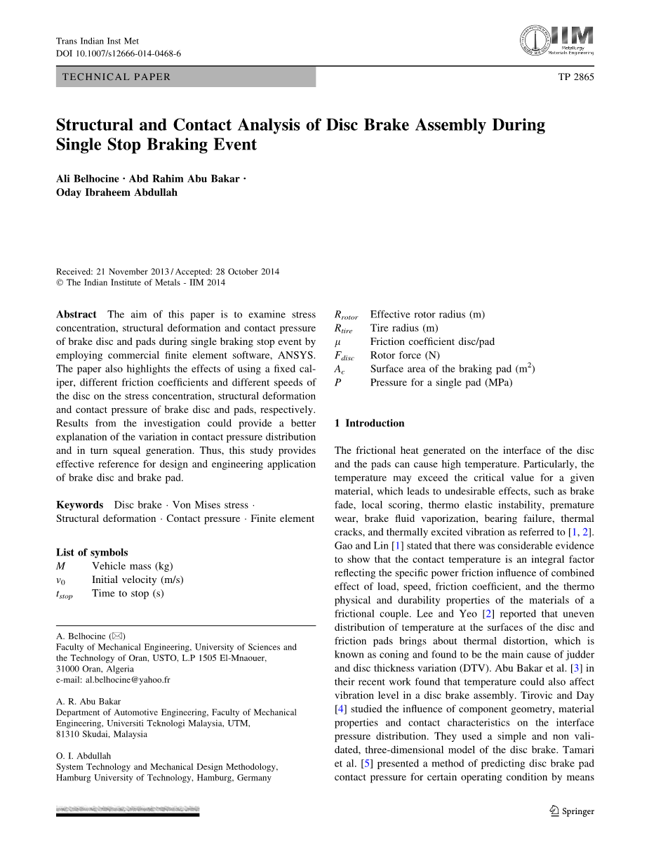 本文采用商用有限元软件 ANSYS 对制动盘和垫片在单制动停止时的应力集中、结构变形和接触压力进行了研究。本文还着重介绍了采用制动钳、不同摩擦摩擦系数和不同速度的车轮对制动盘和摩擦片的应力集中、结构变形和接触压力的影响。通过调查, 可以更好地解释接触压力分布的变化以及反过来的尖叫产生。为此, 本研究为制动盘和刹车片的设计和工程应用提供了有效的参考。
