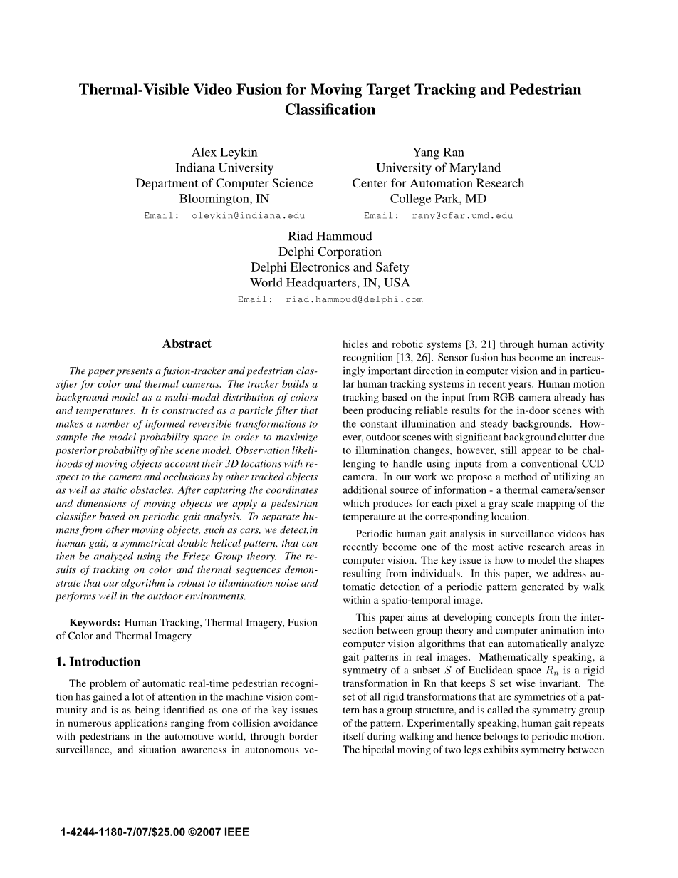 自动实时行人识别的问题在机器视觉领域引起了很多关注,并且被认为是从汽车世界中的行人碰撞避免到边界监视的众多应用中的关键问题之一,以及 自主车辆和机器人系统的情景意识[3,21]通过人类活动识别[13,26], 近年来,传感器融合已成为计算机视觉和特别是人体跟踪系统中日益重要的方向。 基于RGB摄像头输入的人体运动跟踪功能已经为恒定照度和稳定背景的室内场景产生了可靠的结果。 然而,由于照明改变而具有明显背景混乱的户外场景,然而,对于使用来自常规CCD照相机的输入来说仍然是具有挑战性的。 在我们的工作中,我们提出了一种利用额外信息源的方法 - 一种热像仪/传感器,它为每个像素生成对应位置温度的灰度映射。