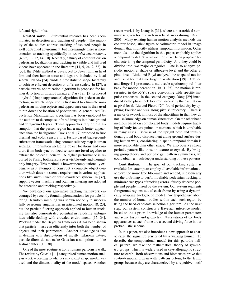 人类执行的最常规行为之一就是散步。 Gavrila [11]根据是否使用显式形状模型和模型空间的维度对人体运动分析工作进行了分类。另一项最近的工作是Liang [31],1997年至2001年期间给出了有关区域研究的层次概要。许多现有的人体运动分析方法在图像域中使用基于轮廓的,简单的图形或体积模型,隐式地利用时间信息。其他方法,如本文中的算法,明确地应用时间模型。已经提出了几种解决方案来表征时间周期性。它们可以分为两大类。一种是在形状或轮廓层面分析周期性运动,另一种是在像素层面分析周期性运动。 Little和Boyd分析了运动的形状并将其用于实时目标分类[19]。 Adelson和Berger [1]提出了一个运动感知的多尺度时空滤波器组。在[1,25]中,运动用X-Y-t空间中的特定脉冲响应来表示。在第二类中,Yang [29]引入了视频锁相环来感知像素级的振荡。 Liu和Picard [20]通过沿像素轨迹应用傅立叶分析发现了周期性。在大多数算法中存在主要缺点,即它们不使用关于人体运动学的知识。另一方面,基于复杂身体模型的方法需要跟踪身体特征点或标记,这在很多情况下是不可靠的。由于人体步行时直立姿态和沿地表的平移全球体位移,在时空域考虑比其他空间更合理。我们也观察到强烈的周期性模式,如纹理或水晶。通过桥接群体理论和周期性步态模式对称,我们可以更深入地了解这些模式。 成果. 我们的跟踪系统的目标是双重的:首先尝试利用所有可用的信息来实现无噪声的斑点图,其次,随后使用斑点图执行可靠的行人跟踪,以最小化两种类型的跟踪错误 - 错误检测到的人和 系统错过了人们。 我们的系统通过使用动态适应背景模型来分割每帧中的前景区域。 我们通过使用头候选者选择算法来假设每个这样的区域内的人体数量。 作为下一步,我们的系统基于人类参数和场景布局和几何的先验知识构建贝叶斯推理模型。 在我们的概率方案中,观察每一帧的身体外观是第二动力。