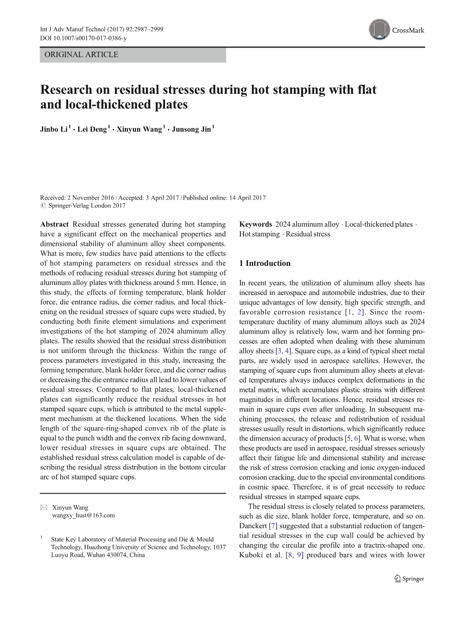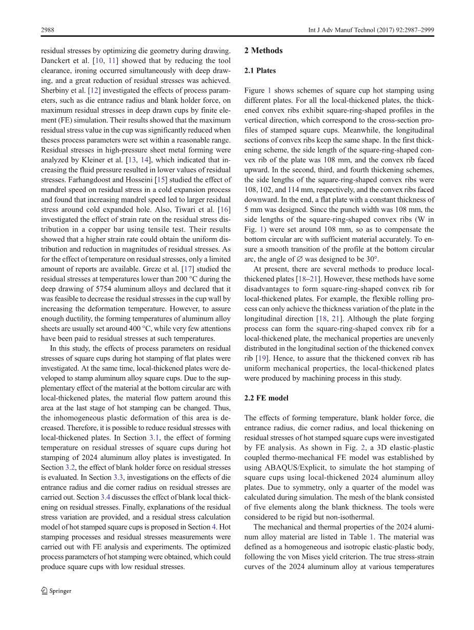 平板和局部加厚板热冲压残余应力的研究外文翻译资料