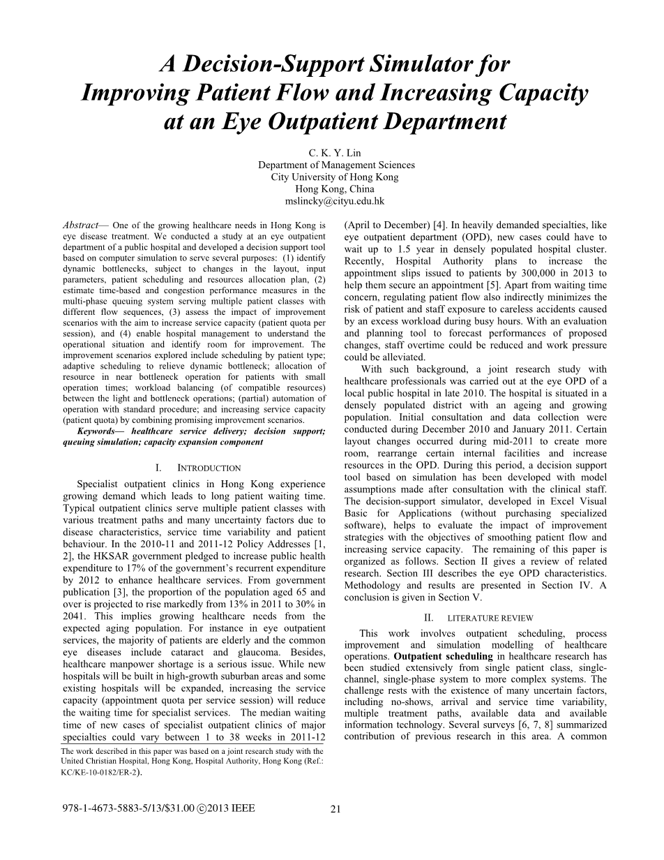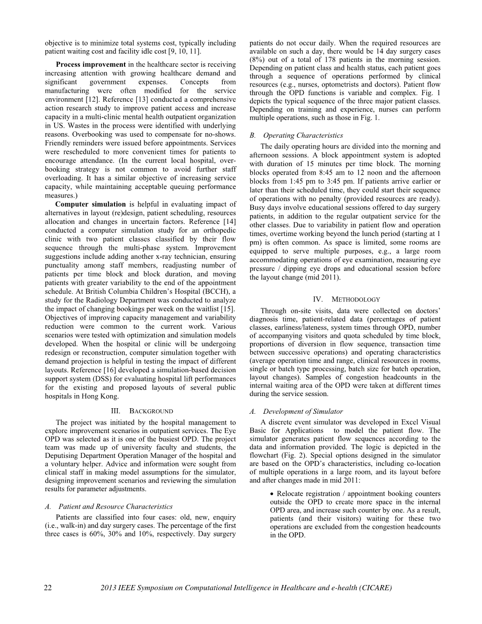 摘要——香港日益增长的医疗保健需求之一是眼疾的治疗。我们进行了一项研究,在一个公立医院的眼科门诊,基于计算机仿真开发了一个决策支持工具提供以下目的的服务:(1)通过布局的变化,输入参数,病人调度和资源配置计划, 确定动态瓶颈;(2)基于时间的估计和拥堵结构,提供多阶段排队系统以服务多个病人类不同流序列;(3)评估改进方案的影响,目的是增加服务能力(每个病人配额);(4)使医院管理了解经营情况和识别改进的余地,改进场景探索包括通过病人类型来调度;自适应调度来缓解动态瓶颈;分配资源瓶颈附近的小手术患者;光和瓶颈操作之间的工作负载平衡(兼容资源);(部分)采用标准程序的操作自动化;通过结合有希望的改进方案,增加服务能力(患者配额)。