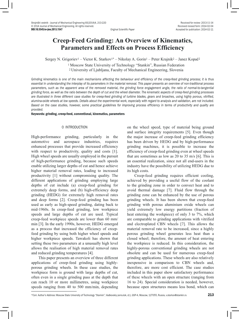 题目:Creep-Feed Grinding: An Overview of Kinematics, Parameters and Effects on Process Efficiency
