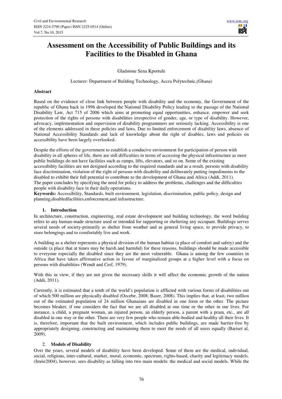 目前,估计世界上有十分之一的人口患有各种形式的残疾,即世界人口中有5亿残疾人。这意味着,至少在估计的2400万加纳人口中有两百万人以某种形式或另一种形式残疾。如果我们考虑到我们一生都在残疾的事实,那么情况就会变得更加黯淡。例如,小孩,孕妇,受伤的人,老人,带婴儿车的父母等都是以某种方式残疾的。很少有人一辈子身体健康。因此,重要的是包括公共建筑在内的建筑环境通过适当设计,建造和维护以平等满足所有用户的需求而实现无障碍(Bariset al,2009)。