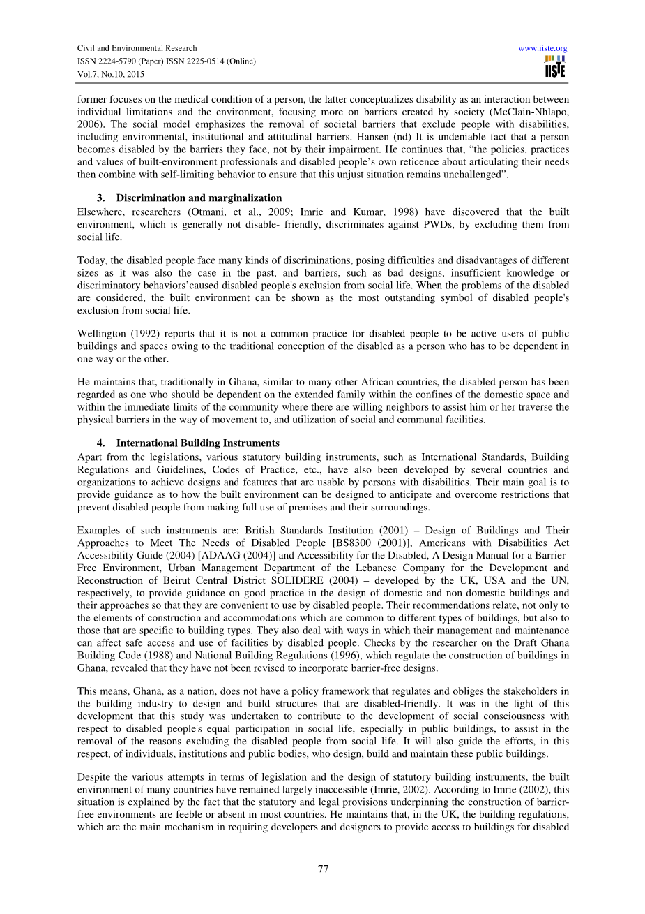 尽管在立法和设计法定建筑工具方面进行了各种尝试,但许多国家的建筑环境仍然令残疾人基本无法进入(Imrie,2002年)。根据伊姆里(Imrie,2002)的观点,这种情况可以解释为,在大多数国家,在建立无障碍环境的法律和法律规定这方面是空白的。他认为,在英国,建筑法规是要求开发商和设计人员为残疾人提供建筑物的主要机制,它是微弱而无效的,因为它只要求开发人员在新的公共建筑和重大装修中为残疾人制定“合理规定”。这种发展导致了这样一种情况,即使进行了这些尝试,尚未明确界定的所谓“合理规定”在消除建筑环境中的障碍方面还不够。
