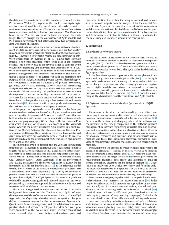 本这篇文章由七个部分组成。第2节提供了关于传统和敏捷软件开发模型、软件度量基础和GQM方法、能力成熟度模型集成、称为定量过程管理评估方法的预定义评估方法以及软件开发模型比较研究的相关工作的背景信息。第3节提供了整个案例研究的概要,包括背景和范围、研究目标和设计,并分析了目标和措施。第4节描述了分析方法,并演示了增量过程分析的示例输出。 第5节介绍了比较的定量结果,并根据增量和敏捷过程的过程设定引出的定性数据讨论了这些结果背后的基本原理。 第6节阐述了案例研究对有效性的威胁,第7节提供了结论。