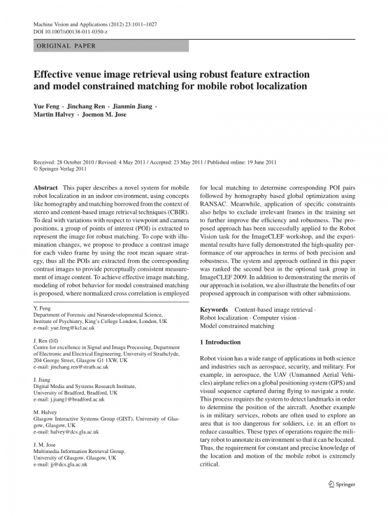 摘要 本文描述了一种新的移动机器人在室内环境中定位的系统,使用了从立体声和基于内容的图像检索技术(CBIR)的背景中借鉴的单应性和匹配等概念。为了处理关于视点和相机位置的变化,提取一组兴趣点(POI)以表示用于稳健匹配的图像。为了应对照明变化,我们建议使用均方根策略为每个视频帧产生对比度图像,从对应的对比度图像中提取所有POI以提供图像内容的测量。为了实现有效的图像匹配,提出了模型约束匹配的机器人行为建模,确定相应的POI对,然后使用RANSAC进行基于单应性的全局优化。同时,特定约束的应用还有助于排除集中的不相关帧以进一步提高效率和鲁棒性。所提出的方法已经成功应用于ImageCLEF研讨会的机器人视觉任务,实验结果充分展示了我们的方法在精度和鲁棒性方面的高性能。本文概述的系统和方法在ImageCLEF 2009中的可选任务组中排名第二。除了单独展示我们的方法的优点外,我们还说明了我们提出的方法与其他提交方法相比的好处。