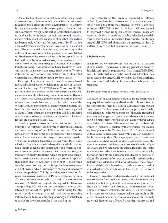 本文的其余部分安排如下。在第二节我们描述了机器人视觉领域的先进技术水平,并概述了ImageCLEF 2009中机器人视觉任务的目标。第三节提出了基本的POI探测器及其衍生的对比图像的改进版本。在第四节给出了模型约束匹配的机器人行为建模。ImageCLEF 2009的实验结果和讨论见第五节。最后在第六节中提出了一些结论性意见。