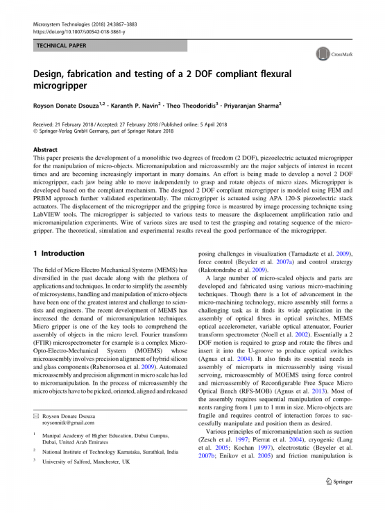 本文介绍了一种单片二自由度(2自由度)的用于操纵微对象的压电驱动微夹持器。微操作和微装配是近年来人们关注的主要课题,在许多领域变得越来越重要。正在努力开发一个新的2自由度微夹持器,每个微夹持端能够独立移动,从而掌握和旋转物体的微观尺寸。微夹持器是基于兼容的机制开发的。采用FEM和PRBM方法对设计的2自由度柔性微夹持器进行了建模,并进行了实验验证。微夹持器是使用APA120-S压电堆栈驱动器驱动。利用LabVIEW工具,利用图像处理技术测量了微夹钳的位移和夹持力。这个微夹持器进行了各种测试,以测量位移放大比和微操作实验。采用不同尺寸的金属丝对微夹持器的抓取顺序和旋转顺序进行测试。理论、仿真和实验结果表明,该微夹持器具有良好的性能。