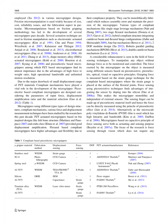在过去的十年里,研究者们研究了不同类型的微爪设计结构、柔性机构、各种力和位移测量技术。压电驱动微夹持器的设计是基于生物灵感,如鱼骨结构(Martinez和Panepucci,2007)和螃蟹爪(Khare等,2007),这些为夹持器提供了良好的位移放大。基于弯曲的柔性微夹持器由于他们的顺从性能,使得他们具有更大的优势和柔性,。他们可以它们可以整体制造,减少装配误差,保持微爪的精度。各种类型的柔性机制,如单级杠杆机制(Nah和zhong,2007),两阶段弯曲机制(Dsouza等,2015;Gao等,2012),悬臂梁与柔性铰链构型相结合的混合柔性结构(Zubir和Shirinzadeh,2009),四连杆机构(Beroz等,2011),2自由度模块化设计(Xu,2012),机器人平行导向机制(RPGM)(Shi等,2013),双悬臂梁机构(Lu等,2014)。