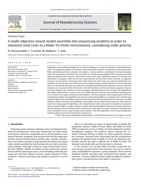 如今,随着客户需求的多样化,混合型装配线越来越多地被使用。该领域的一个重要问题是确定进入生产线的产品顺序,在确定最佳产品序列之前,引入了一个新程序来选择进入车间的重要订单。因此,使用基于三个标准的分析层次过程(AHP)方法对订单进行分类:每个订单的临界比率(CR0),客户的意义程度和产品中的创新,而最后一个呈现为第一个时间。在本研究中,提出了六个目标函数:最小化公用事业工作成本,总的设置成本和总生产率变化成本是之前提出的优化目标,另一个目标是最小化总闲置成本,同时另外两个关于最小化操作员数目的新目标错误成本和总延迟成本首次出现。总延迟成本试图选择一系列产品,以最大限度地降低高优先级客户的延迟成本。首先,为了检查模型的可行性,使用GAMS软件。在这种情况下,GAMS软件无法搜索所有解空间,因此在两个阶段中尝试并且因为该问题是非确定性多项式问题,所以使用粒子群优化(PSO)和模拟退火(SA)算法。对于小型问题,要将精确方法与提出的算法进行比较,必须使用启发式算法分两个阶段并使用GAMS软件来解决问题,而对于大型问题,问题可以通过两种方式解决(一个阶段和两个阶段)通过使用提出的算法;计算结果和成对比较(基于符号测试)表明GAMS是解决小问题的合适软件,而对于大尺寸问题,目标函数在一个阶段解决比两个阶段更好;因此,建议在一个阶段解决大问题的阶段中去解决问题。PSO算法优于基于目标函数和成对比较的SA算法。