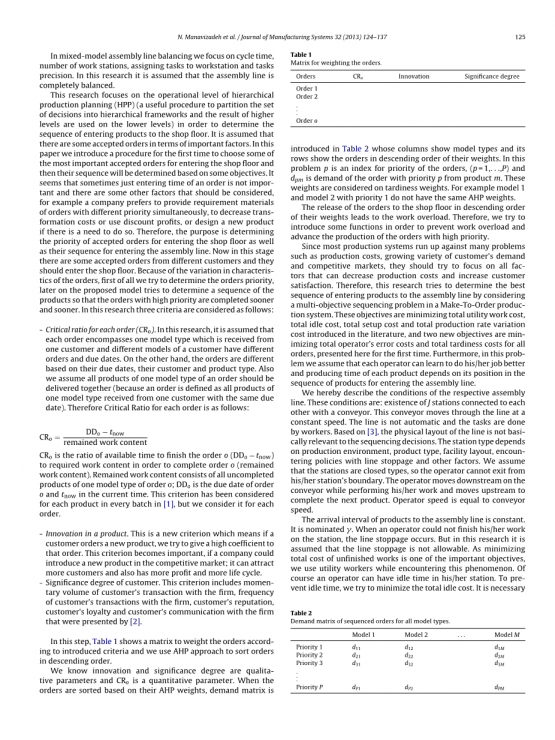 介绍表2 其列显示模型类型,其行按其权重的降序显示顺序。在该问题中,p是订单优先级的索引,(p = 1,...,P),下午是自产品m的优先级为p的订单的需求。这些权重考虑了迟到权重。例如,具有优先级1的模型1和模型2不具有相同的AHP权重。