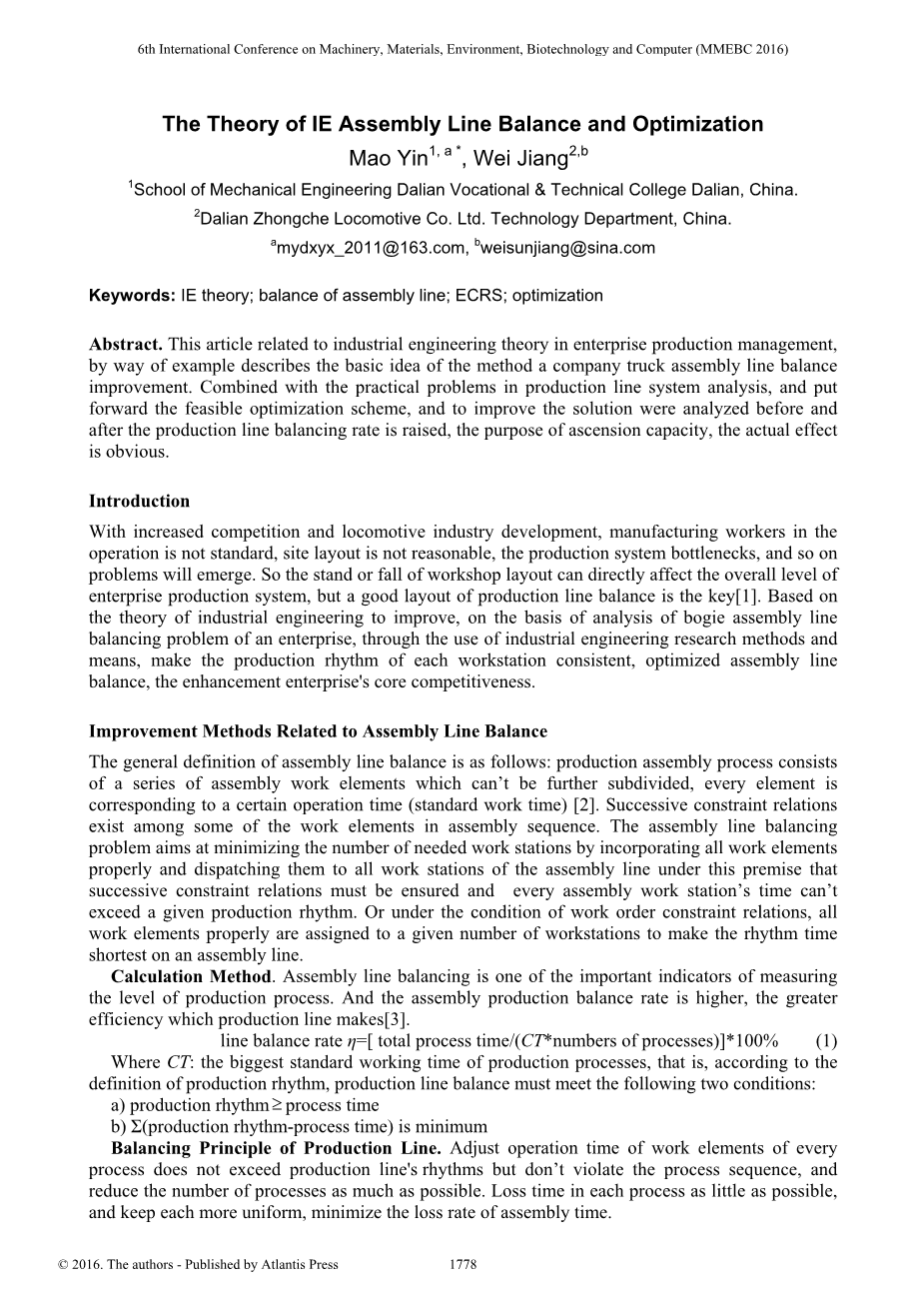 摘要:本文结合企业生产管理中的工业工程理论,通过某公司卡车总装线平衡改进实例阐述了该方法的基本思想。结合生产线系统分析中的实际问题,提出了可行的优化方案,并对改进方案进行了评价分析,提高了生产线平衡率,达到提升生产能力的目的,实际效果明显。