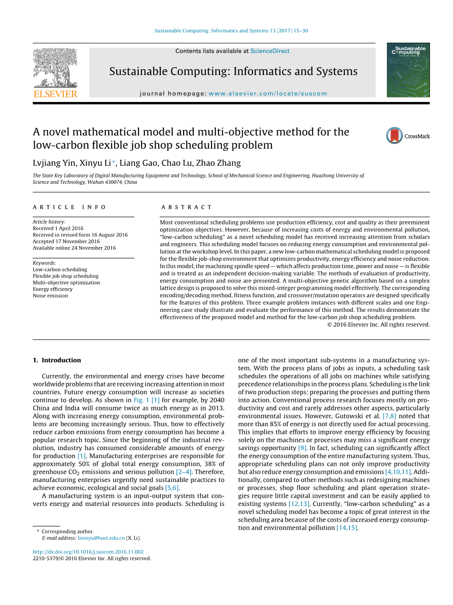 关于“低碳调度”的研究已逐渐增加[4]。对于单机调度环境,Mouzon等人。 [3]提出了一个多目标数学规划模型和几种算法来解决单个CNC机床调度问题,目的是减少能耗和总完成时间。Mouzon和Yildirim [15]将贪婪随机自适应搜索(GRAS)算法应用于单机多目标优化调度问题,目的是使总能耗和总拖延最小。 Rager等人[16]提出了一种面向能源的并行机调度的进化算法。对于流水车间环境,Fang等人[17,18] 针对其调度问题提出了一些新的数学编程模型,该模型考虑了峰值功率负载,能耗以及相关的碳足迹以及周期时间。Bruzzone等人[19]提出了一种基于混合整数编程模型的方法,该模型中的参考计划由高级计划和计划(APS)系统修改,以在不更改工作分配和顺序的情况下考虑能耗。戴等人[20]提出了一种用于柔性流水车间调度的节能模型,并开发了一种遗传模拟退火算法来解决该问题。罗等人[21]提出了一种新的蚁群优化元启发式算法,以解决混合流水车间调度问题的生产效率和电力成本。凯勒等人[22] 针对混合流水车间调度问题开发了一种启发式方法。对于作业车间调度环境,Liu等人[9]针对总作业能耗和总加权拖延时间的目标,针对经典作业车间调度问题(JSP)开发了一种多目标调度方法。