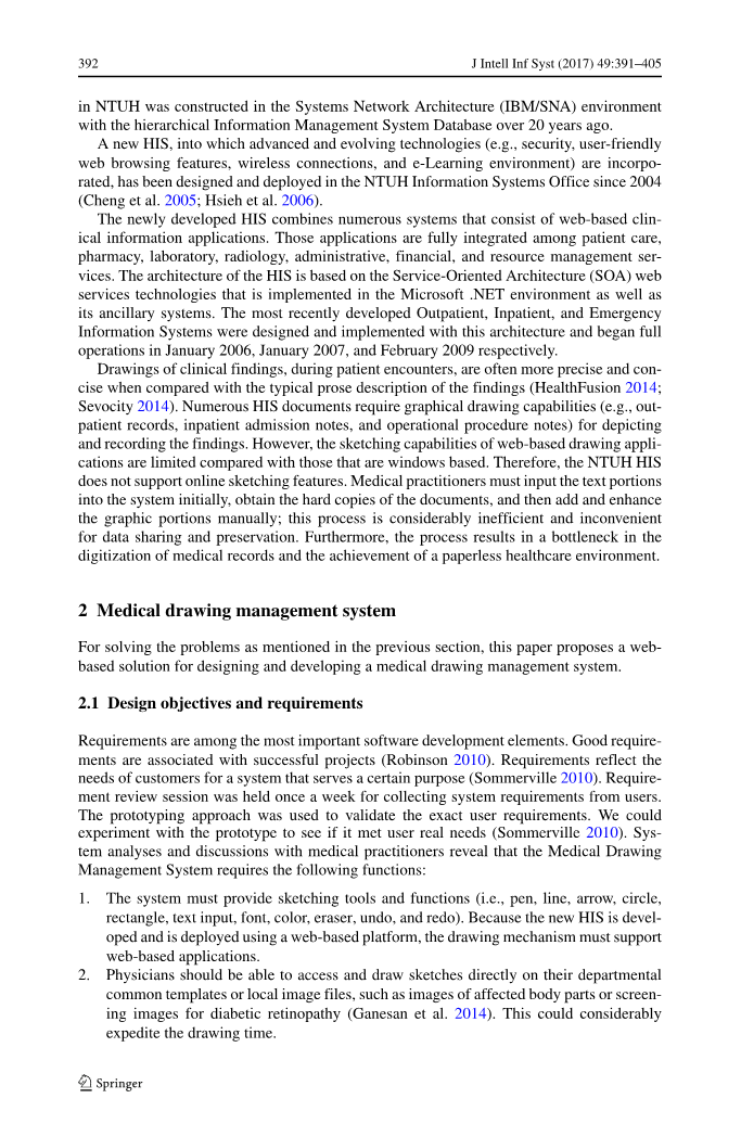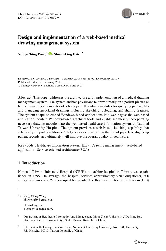 在患者患病期间,临床发现的图纸通常与结果的典型散文描述相比更精确和更精确(HealthFusion 2014; Sevocity 2014)。 许多HIS文件需要图形绘制功能(例如,患者记录,住院患者入院记录和操作程序说明)以描绘和记录结果。 然而,与基于窗口的应用程序相比,基于Web的绘图应用程序的草图绘制功能受到限制。 因此,NTUH HIS不支持在线草图功能。 医务人员必须先将文本部分输入系统,获取文件的硬拷贝,然后手动添加和增强图形部分; 这个过程效率很低,不便于数据共享和保存。 此外,该过程导致了医疗记录的数字化和无纸化医疗保健环境的实现的瓶颈。