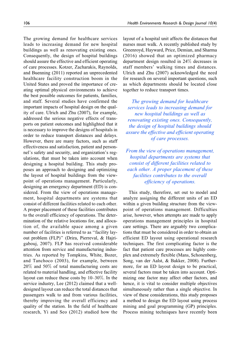 Kotzer、Zacharakis、Raynolds和Buenning在2011年报道了美国前所未有的医疗设施建设热潮,并证明了为患者、家庭以及工作人员创造最佳物理环境的重要性。以下的几项研究证实了医院设计对护理质量的重要影响。例如Ulrich和Zhu在2007年讨论了运输对患者愈后的严重负面影响,并强调有必要改进医院的设计,以减少运输距离和延迟。然而,在设计医院建筑时必须考虑其他的许多因素,如工作人员的效率以及满意度、病人和人员的安全与保障以及组织的规章制度。本研究从运营管理的角度出发,提出了医院建筑布局设计与优化的方法。特别是设计一个急诊科(ED)。从运营管理的角度来看,医院科室是由相互关联的不同设施组成的系统,而这些设施的适当安置,有助于提高行动的总效率。在给定数量的设施之间确定可用空间相对位置和分配被称为“设施布局问题(FLP)”。FLP受到了很多服务业和制造业的极大关注。例如,Tompkins, White, Bozer, 以及 Tanchoco(2003)在2003年的报告显示,20%到50%的制造成本与材料处理有关,有效的设施布局可以将这些成本降低10-30%。在服务业,Lee认为一个设计良好的布局可以减少乘客从各种设施步行的总距离,从而提高车站的整体效率和质量。在医疗保健研究领域,Yi和Seo在2012年研究了医院单位的布局是如何影响护士必须不行的距离。Greenroyd、Hayward、Price、Demian和Sharma(2016)最近发表的一项研究表明,优化的药房设计可使工作人员的步行时间和距离减少24%。Ulrich和Zhu(2007)承认有必要对几个重要问题进行研究,比如哪些部门应该安排在距离较近的地方,以减少运输时间。