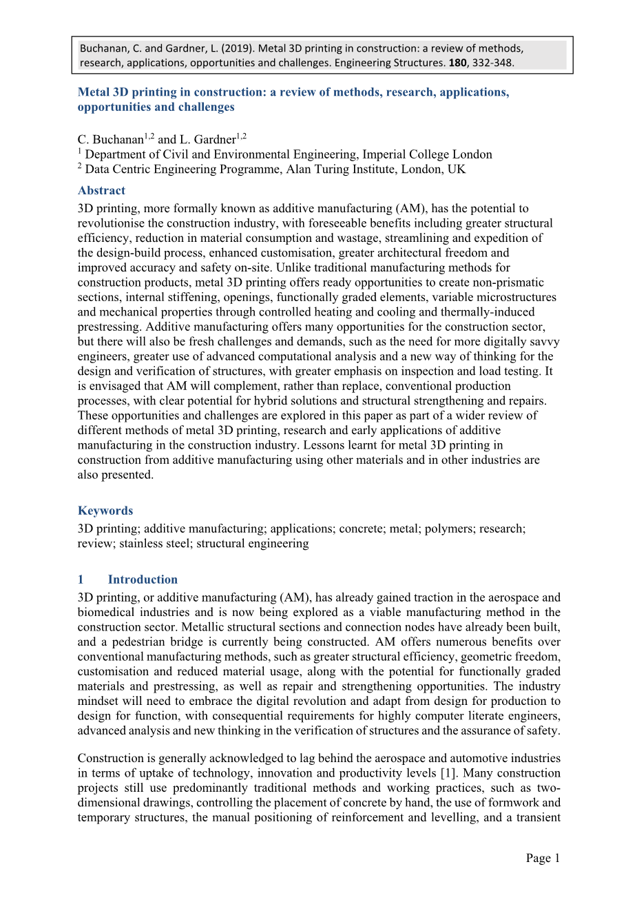 金属增材制造目前用于生物医学和航空航天工业中,以生产高价值的最终用途零件,这些零件高度定制或少量生产[3,17]。2014年,整个AM市场规模估计超过40亿美元,最终用途零件市场为17亿美元,预计到2020年将增长到210亿美元以上[3]。除了传统的高附加值行业外,建筑行业也开始探索增材制造,以建造混凝土桥梁,房屋和办公室[18,19],塑料房屋[20]以及金属连接节点和桥梁[21,22]。快速的城市化,气候变化和资源匮乏导致建筑行业承受越来越大的压力,从而导致人们需要更高效的建筑技术。据估计,全球建筑成本降低1%,每年可节省1000亿美元[23]。英国政府设定了以下目标:到2025年,将建筑的初期和整个生命成本降低33%,从开始到完成建设项目的时间减少一半,并从建筑环境中减少一半的温室气体排放[ 24]。建筑师同时在形状和形式上不断突破[25]。施工中的增材制造仍处于实验阶段[26],但是这些新的成型方法具有巨大的潜力来建造结构部件,甚至整个结构,具有几何自由度,工程材料特性,减少的材料使用量,减少的建筑浪费,缩短的建造时间并降低了运输成本。英国政府设定了以下目标:到2025年,将建筑的初期和整个生命成本降低33%,从开始到完成建设项目的时间减少一半,并从建筑环境中减少一半的温室气体排放[ 24]。建筑师同时在形状和形式上不断突破[25]。施工中的增材制造仍处于实验阶段[26],但是这些新的成型方法具有巨大的潜力来建造结构部件,甚至整个结构,具有几何自由度,工程材料特性,减少的材料使用量,减少的建筑浪费,缩短的建造时间并降低了运输成本。英国政府设定了以下目标:到2025年,将建筑的初期和整个生命成本降低33%,从开始到完成建设项目的时间减少一半,并从建筑环境中减少一半的温室气体排放[ 24]。建筑师同时在形状和形式上不断突破[25]。施工中的增材制造仍处于实验阶段[26],但是这些新的成型方法具有巨大的潜力来建造结构部件,甚至整个结构,具有几何自由度,工程材料特性,减少的材料使用量,减少的建筑浪费,缩短的建造时间并降低了运输成本。从开始到完成建设项目的时间减少一半,到2025年建筑环境产生的温室气体排放减少一半[24]。建筑师同时在形状和形式上不断突破[25]。施工中的增材制造仍处于实验阶段[26],但是这些新的成型方法具有巨大的潜力来建造结构部件,甚至整个结构,具有几何自由度,工程材料特性,减少的材料使用量,减少的建筑浪费,缩短的建造时间并降低了运输成本。从开始到完成建设项目的时间减少一半,到2025年建筑环境产生的温室气体排放减少一半[24]。建筑师同时在形状和形式上不断突破[25]。施工中的增材制造仍处于实验阶段[26],但是这些新的成型方法具有巨大的潜力来建造结构部件,甚至整个结构,具有几何自由度,工程材料特性,减少的材料使用量,减少的建筑浪费,缩短的建造时间并降低了运输成本。