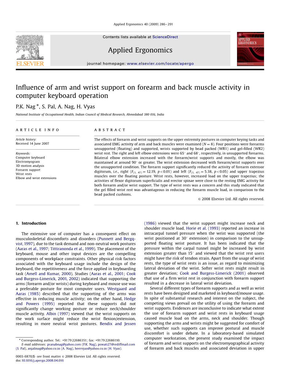 摘要:前臂和手腕的影响支持在电脑控任务和上肢体式EMG活动相关联的手臂和背部肌肉(Nfrac14;8)。检查四个职位是前臂支持(浮动)和支持,支持的手腕珠包装(WR1)和制成(WR2)手腕休息。在没有支撑的前臂中,右肘和左肘的伸展分别为651和681。双侧肘关节的伸展随着前臂/腕关节的支撑而增加,大部分情况下,肘关节保持在901左右或更大。在没有支撑的情况下,随着前臂/手腕支撑的增加,手腕伸展度降低。前臂支撑显著降低了前臂指伸肌的活动,即,对吧(F (47) 12.19frac14;, po0.01)和左(5.38 F (1) 47)frac14;, po0.05)和上斜方肌的肌肉在漂浮的姿势。然而,手腕休息增加了斜方肌上部的负荷;前臂和/或腕部支撑的指浅屈肌和竖脊肌的肌电活动与静止肌电活动接近。腕部休息的类型是一个值得关注的问题,本研究表明,与珠状填充垫相比,凝胶填充腕部休息有利于减少前臂肌肉负荷。