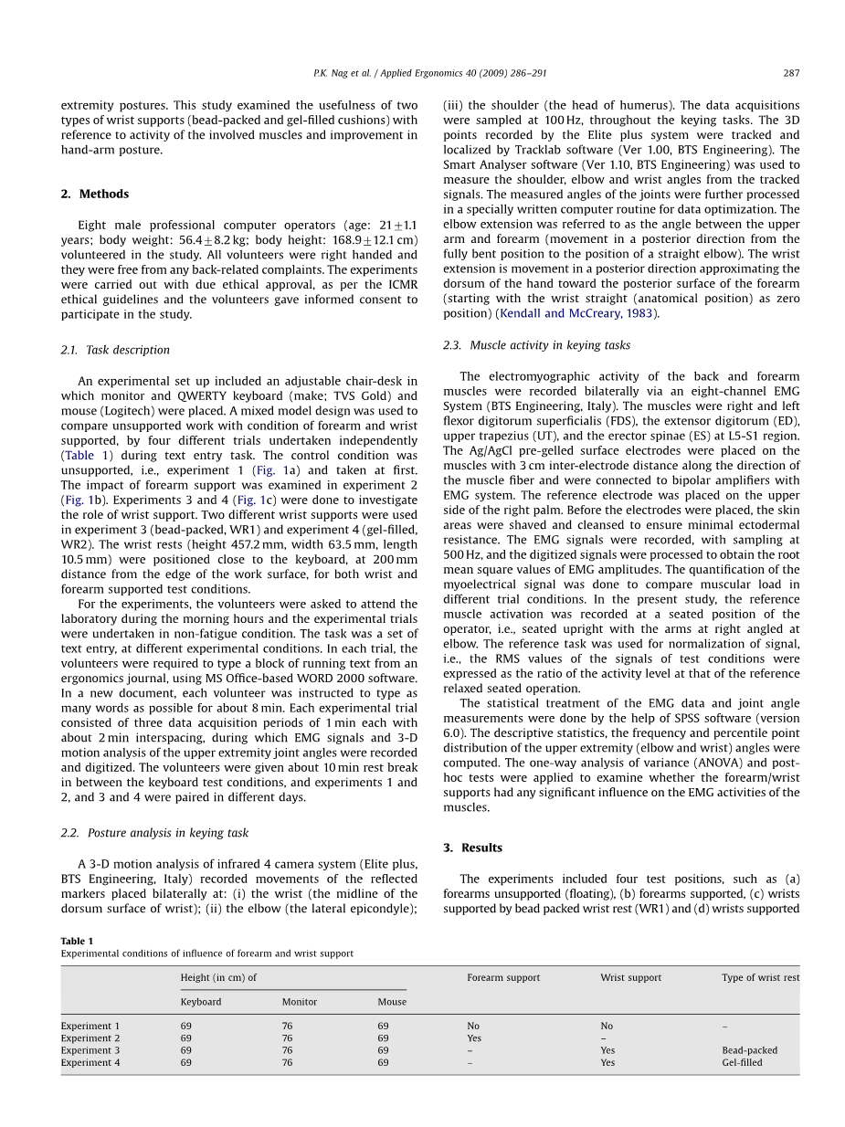 实验装置包括一个可调节的椅子桌,显示器和QWERTY键盘(make;tvs gold)以及鼠标(logitech)。采用混合模型设计,通过在文本输入任务期间独立进行的四个不同试验(表1),比较无支撑工作与前臂和手腕支撑条件。不支持控制条件,即实验1(图1a)并首先进行。实验2检查了前臂支撑的影响(图1b)。实验3和4(图1c)是为了研究手腕支撑的作用。在实验3(珠填充,WR1)和实验4(凝胶-LLED,WR2)中使用了两种不同的腕托。腕托(高457.2 mm,宽63.5 mm,长10.5 mm)放置在靠近键盘的位置,距离工作面边缘200 mm,用于手腕和前臂支撑的测试条件。在实验中,志愿者们被要求在早晨的时间进入实验室,在非疲劳状态下进行实验试验。在不同的实验条件下,任务是一组文本输入。在每项试验中,志愿者需要使用基于MS-of-fice的Word 2000软件,在人体工程学期刊上键入一段运行文本。在一份新的文件中,每个志愿者被要求尽可能多地输入单词,时间大约为8分钟。每个实验性试验包括三个数据采集周期,每个数据采集周期为1分钟,间隔约2分钟,在此期间,记录并数字化上肢关节角度的肌电图信号和三维运动分析。受试者在键盘测试条件下休息约10分钟,实验1和2、3和4在不同时间配对。