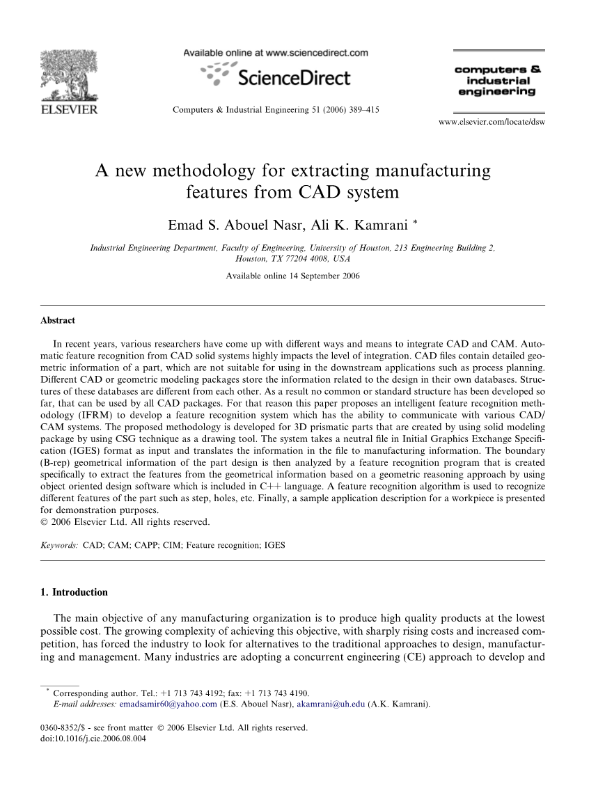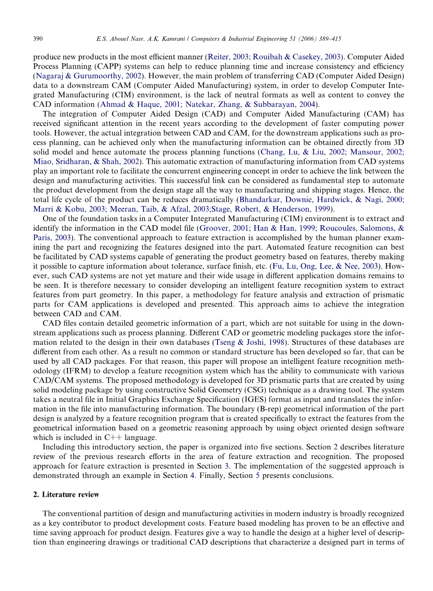 因为计算工具的快速发展,近年来计算机辅助设计(CAD)和计算机辅助制造(CAM)的集成受到了广泛的关注。但是只有在能从3D实体模型直接获得制造信息,过程计划功能自动化的情况下,CAD和CAM之间的实际集成才能用于下游应用(例如工艺计划)(Chang, Lu, 和 Liu, 2002; Mansour, 2002; Miao, Sridharan和Shah, 2002)。从CAD系统自动提取制造信息在促进并发工程概念以实现设计和制造活动两者之间的联系方面起着重要作用。从设计阶段到制造和运输阶段,两者之间有效的联系可以视为实现产品自动化开发的基本步骤。由此产品的总生命周期也可以大大减少(Bhandarkar,Downie,Hardwick和Nagi,2000; Marri和Kobu,2003; Meeran,Taib和Afzal,2003; Stage,Robert和Henderson,1999)。