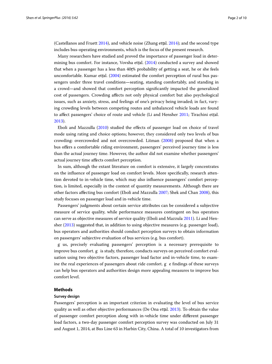 总的来说,虽然关于舒服度方面的现存文献有很多,但是它主要集中于乘客负载对舒适度的影响。能具体的说致力于车载时间,这也可能影响乘客的舒适感觉,这方面的文献是有限的,特别是在量的测量上。尽管还有很多其他的因素会影响乘坐舒服度,(Eboli and Mazzulla 2007; Shek and Chan 2008),但是本文主要研究车辆负载和乘坐时间对乘坐舒服度的影响。
