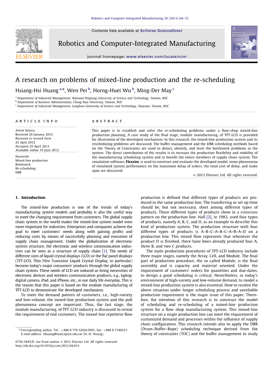 对于生产调度问题,大量的研究人员一直致力于这一领域。然而,其中许多人主要侧重于系统性能的单一或小范围。制造系统实际上需要考虑整个计划和执行阶段的相互作用,从不同的方面揭示实际因素。这项研究试图处理混流线路和重新调度结构;因此,将审查几个主题,包括混流线和混流模型生产、瓶颈和瓶颈转移以及缓冲区管理。. TFT-LCD制造通常是生产某种尺寸或产品的单一生产线。过去研究人员主要侧重于利用DBR技术[3]或重新调度时序和执行频率问题[4–6] ,利用容量约束资源( CCR)的概念进行单流程重新安排。在. TFT-LCD制造中,由于工厂空间和昂贵设施投资的限制,需要建立混流生产线,以提高生产率、效率,并最大限度地降低总成本,包括安装成本、制造成本和库存成本。[7–8]关于重调度问题, Hu 等人[ 9]应用蚁群算法对订单排序问题进行了排序,使订单的平均流时间最短,使紧急订货提前预定。Itayefet等人[10]开发了一种两阶段启发式算法,在第一阶段将固定订单分配给作业,然后使用模拟退火算法优化作业序列。崔等人。[11]采用关键链和TOC开发六种不同的启发式方法解决重排序问题,解决资源和工作优先权问题。Wang和Wang[12]提出了只在机器故障和故障期间考虑重新调度的部分重新安排。