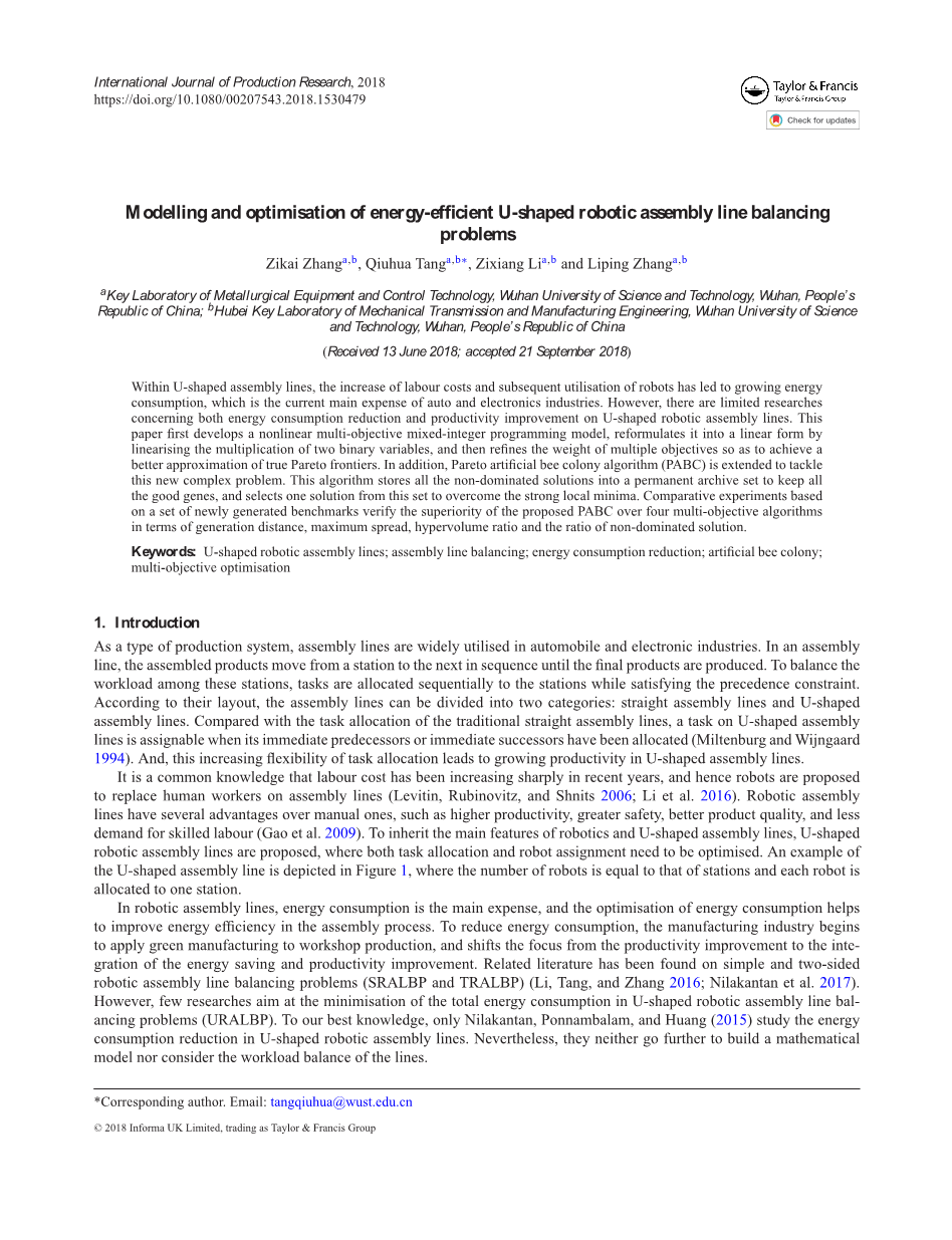 关键词:U型机器人装配线;装配线平衡;降低能耗;人工蜂群;多目标优化