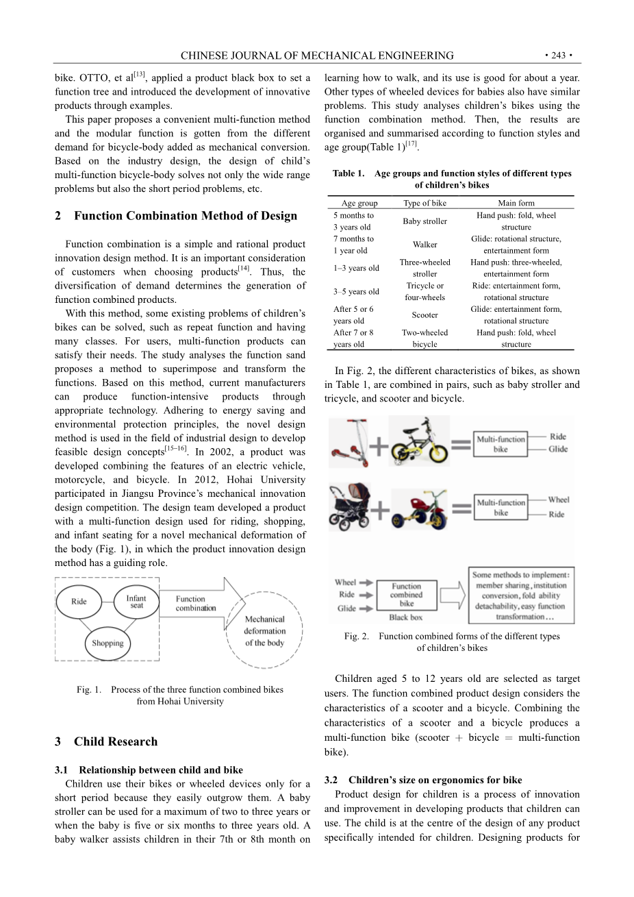 对婴儿车市场的调查发现设计存在的问题。第一,技术水平我国的生产婴儿车已达到一定规模和水平,现代设备的数量车间在增加,儿童的设计水平也在提高,然而,在儿童自行车的设计、复制或模仿是一种严重的现象。因此,产品在市场上的同质化是逐渐增加(例如,婴儿步行者,婴儿巡视员,和儿童自行车[3-4])。不同类型的儿童自行车可能采用不同的制造技术,产品在制造、技术、装备和设备同样的并不多。从出生到青春期,孩子们正处于它们的生长和体型迅速变化。因此,儿童产品生命周期短[5]。设计师应该发展更理性的设计,以人为中心人体计量学和产品生命周期,这可能反映最大程度的产品价值。多功能自行车的研究仅限于查找相关和国际参考文献,提供更多的技术创新专利。例如,赛车和健身自行车的设计可以适用于更多的人,需要解决结合多种功能以适应用户所需经费的问题。关于儿童自行车的类似参考文献有缺乏的、罕见的。这种情况可以从两个方面来看待。从多功能自行车研究展望,徐(6),吴,等人[7]和Wostyn[8]研究和设计了一些多功能自行车通过改进结构。有些是将健身自行车固定在车架上,以及另一些是用折叠框架设计的。儿童自行车研究点,根据儿童的要求,设计了一些新的自行车,如作为多用途的婴儿车,助理小自行车。总之,一些创新的想法值得参考,也许适用于儿童自行车的创新设计。然而,基于自行车设计的研究相对较少。关于多函数方法,导出了一个概念工业设计。Lefever,等人[11],提出了功能分析系统技术(FAST),这使得想法转化为产品设计。通过自上而下的系统分析。使用快速分析自行车的功能和形状矩阵设计一种结合骑自行车和自行车。Otto等人[13]应用一个乘积黑匣子来设置功能树和介绍了创新的发展。通过实例制作产品。本文提出了一种方便的多功能方法,并得到了不同的模块函数。对自行车车身的需求增加为机械转换。基于工业设计的儿童设计多功能自行车车身不仅解决范围广问题还包括短期问题等。