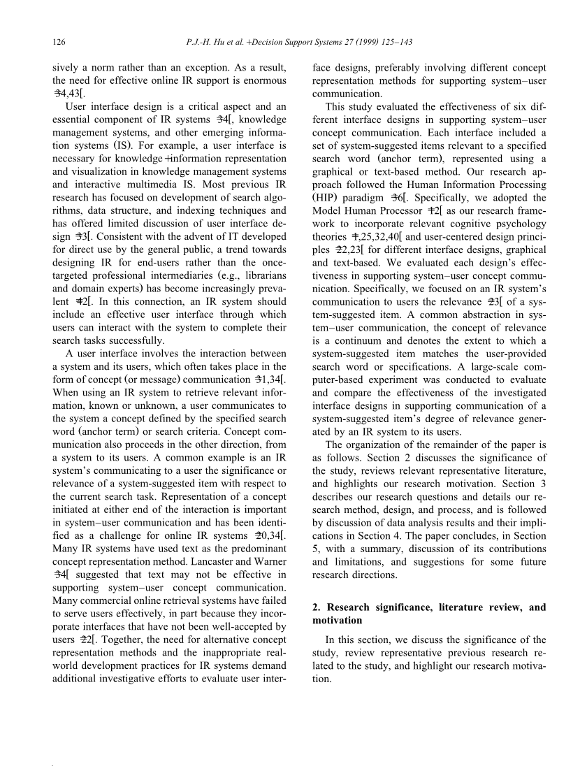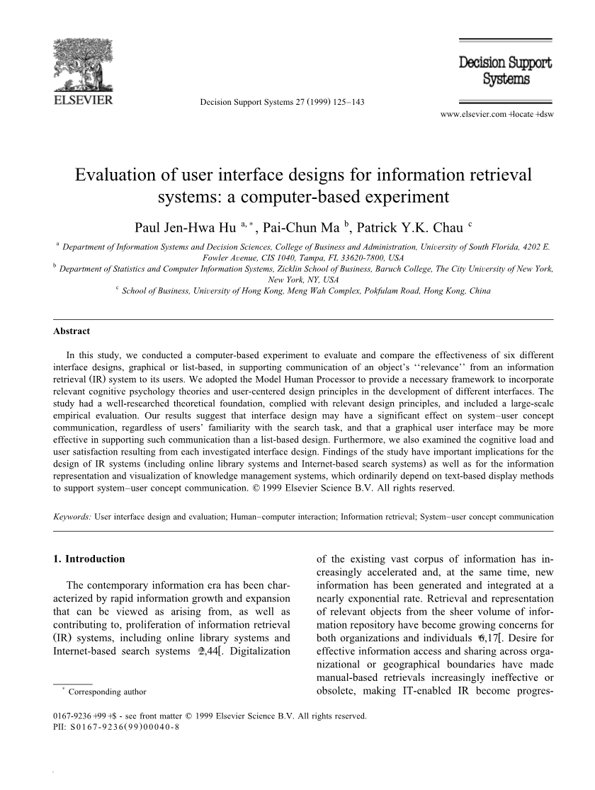 在这项研究中,我们进行了一项以计算机为基础的实验以评估和比较六种以图形或列表为基础的用来支持从信息检索系统到它的用户的对象相关的通信的不同界面的效果。我们采用了模拟处理器从而提供了一个必要的框架,将相关的认知心理学理论和以用户为中心的设计原则纳入不同界面的开发中。本研究具有良好的理论基础,符合相关的设计原则,并且包括了大规模的以实验为依据的评价。我们的研究结果表明,无论用户是否熟悉搜索任务,界面设计对系统-用户概念通信都有显著的影响,同时图形用户界面比基于列表的设计更有效地支持这种通信。此外,我们还测试了每个被调查的界面设计产生的认知负荷和用户满意度。这项研究的结果对包括在线图书馆系统和基于因特网的搜索系统以及信息管理系统的信息表示和可视化具有重要意义,这些系统通常依赖于基于文本的显示方法来支持系统-用户概念通信。
