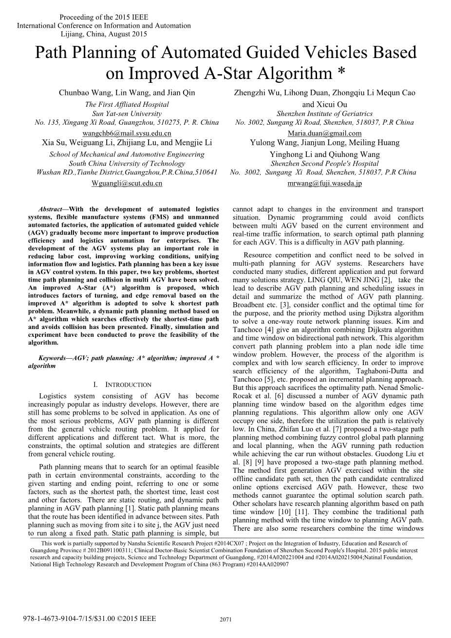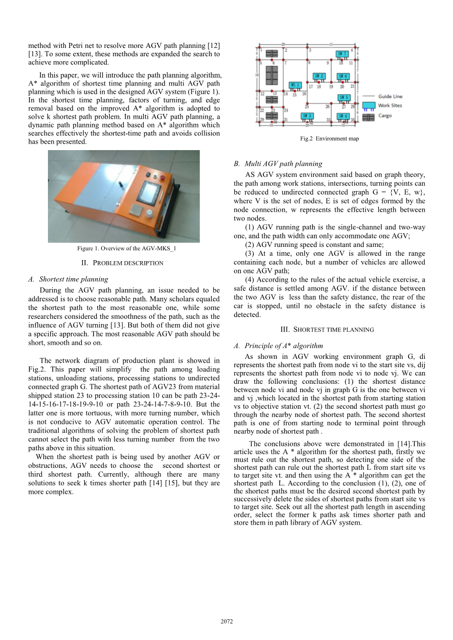 Guodong Liu et al。 [8] [9]提出了一种两阶段路径规划方法。方法第一代AGV在站点离线候选路径集内行使,然后路径候选集中在线选项行使AGV路径。但是,这两种方法不能保证最佳解决方案的搜索路径。其他学者有基于路径时间窗的研究规划算法[10] [11]。他们将传统的路径规划方法与时间窗口结合起来规划AGV路径。还有一些研究人员合并了时间窗口方法与Petri网解决更多的AGV路径规划[12] [13]。 在一定程度上,这些方法扩大了搜索范围,以实现更复杂。 在本文中,我们将介绍在设计的AGV系统中使用的路径规划算法,最短时间规划的A *算法和多AGV路径规划(图1)。 在最短时间规划中,采用基于改进A *算法的转弯因子和边缘去除来解决k最短路径问题。 在多AGV路径规划中,提出了基于A *算法的动态路径规划方法,该方法有效搜索最短路径并避免碰撞。