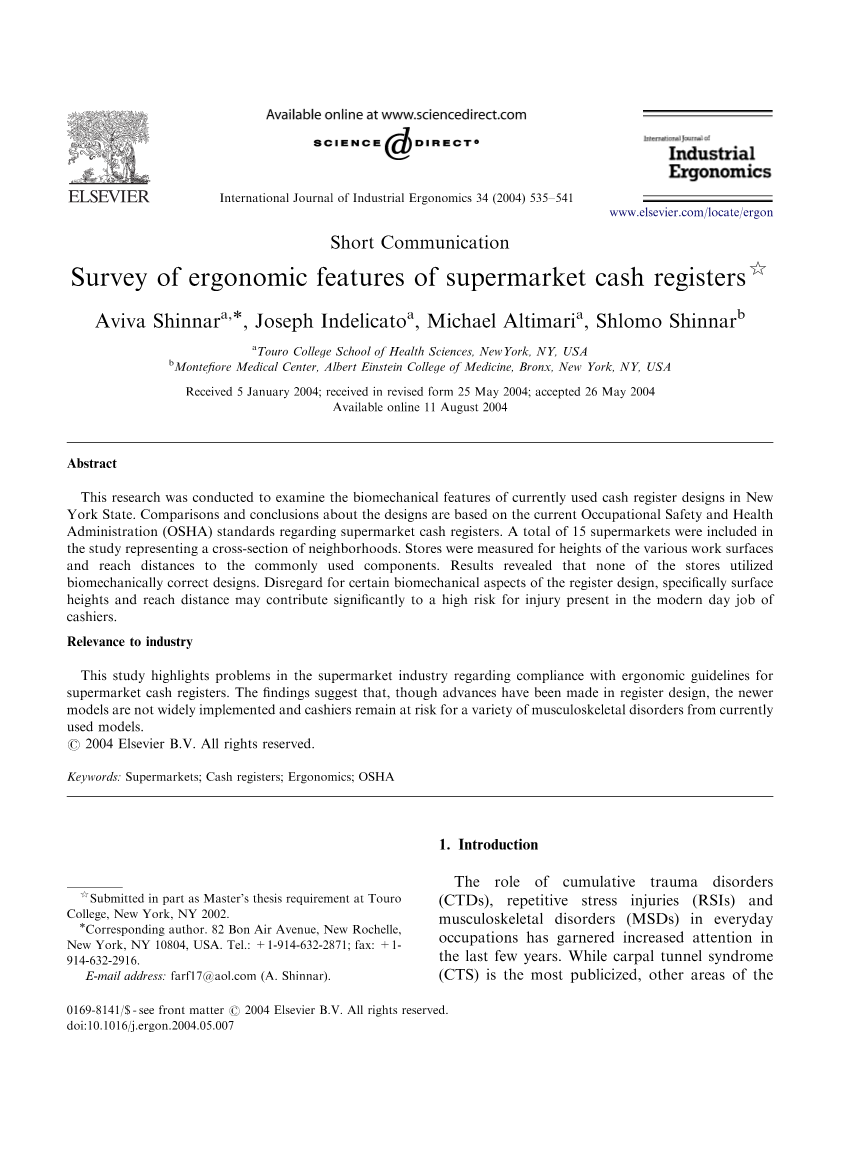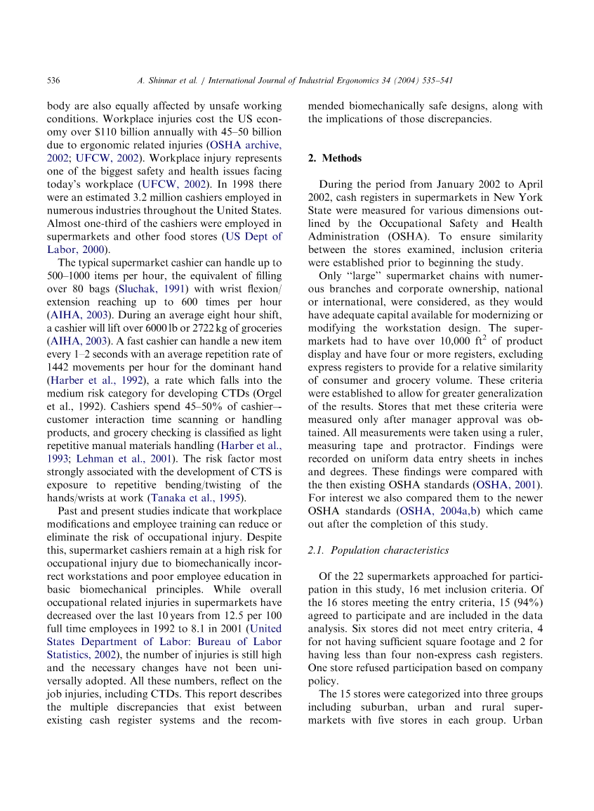 本论文旨在研究纽约目前使用的收银机生物力学特征设计,并基于目前国家安全与健康管理局(OSHA)发布的超市收银机的标准进行有关设计的比较和结论。此次研究共选取了整条街的15座超市为代表。斯特尔测量了各种工作表面与常用部件的高度与距离。结果显示,商店都忽视生物力学方面的重要性而没有采用了正确的生物力学设计。具体地说,表面高度和距离可能会大大地提高收银员在现代工作中受伤的风险。