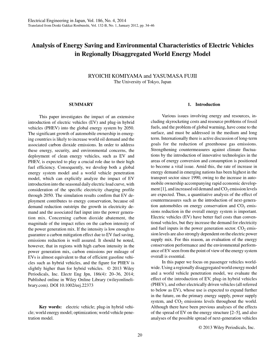本文调查了到2050年将电动汽车(EV)和插电式混合动力汽车(PHEV)广泛引入全球能源系统的影响。新兴国家汽车保有量的显着增长可能会增加世界石油需求,相关二氧化碳排放量。为解决这些能源,安全和环境问题,预计EV和PHEV等清洁能源车的部署将因其高燃油效率而发挥至关重要的作用。因此,我们制定了全球能源系统模型和世界汽车渗透模型,该模型可以明确分析电动汽车引入对季节性日常电力负荷曲线的影响,并考虑到2050年的具体电力充电情况。模拟结果证实电动汽车的部署有助于节约能源,因为减少石油需求超过了电力需求的增长和相关的燃料对发电组合的投入。关于二氧化碳减排,影响的程度取决于发电组合的碳强度。如果强度低到足以保证由于节省电动汽车燃料而产生的碳减排效果,则排放量可以得到保证。但是,应该指出的是,在发电组合中碳强度高的地区,电动汽车每里程的碳排放量几乎与混合动力汽车等高效汽油车相当,而PHEV的数字略高于混合动力车。 copy;2013 Wiley Periodicals,Inc. Electr Eng Jpn,186(4):20-36,2014;在Wiley Online Library(wileyonlinelibrary.com)上在线发布。 DOI 10.1002 / eej.22373