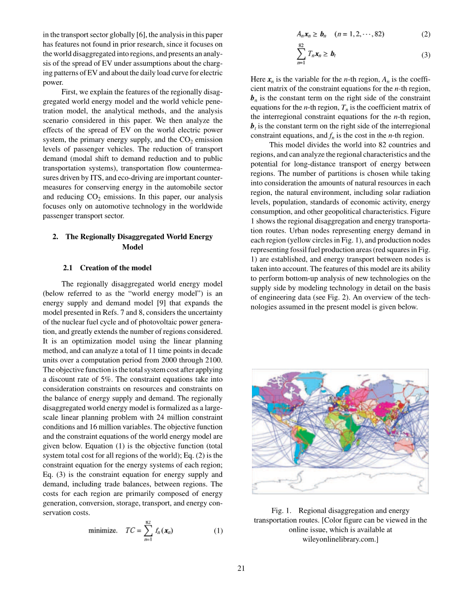 在本文中,我们专注于全球乘用车。 我们使用区域分解的世界能源模型和世界汽车渗透模型,评估引入电动汽车,插电式混合动力汽车(PHEV)和其他电动车辆(以下统称为EV)的影响,其使用是 预计未来将进一步扩大,主要能源供应,供电系统和全球二氧化碳排放水平。 尽管以前对电动汽车在能源结构中的传播效应进行了分析[2-5],并分析了下一代汽车在全球交通运输领域的可能传播[6],但本文的分析 具有先前研究中未发现的特征,因为它侧重于分解到不同区域的世界,并且根据关于电动汽车充电模式和电力日负荷曲线的假设,对电动汽车的传播进行了分析。