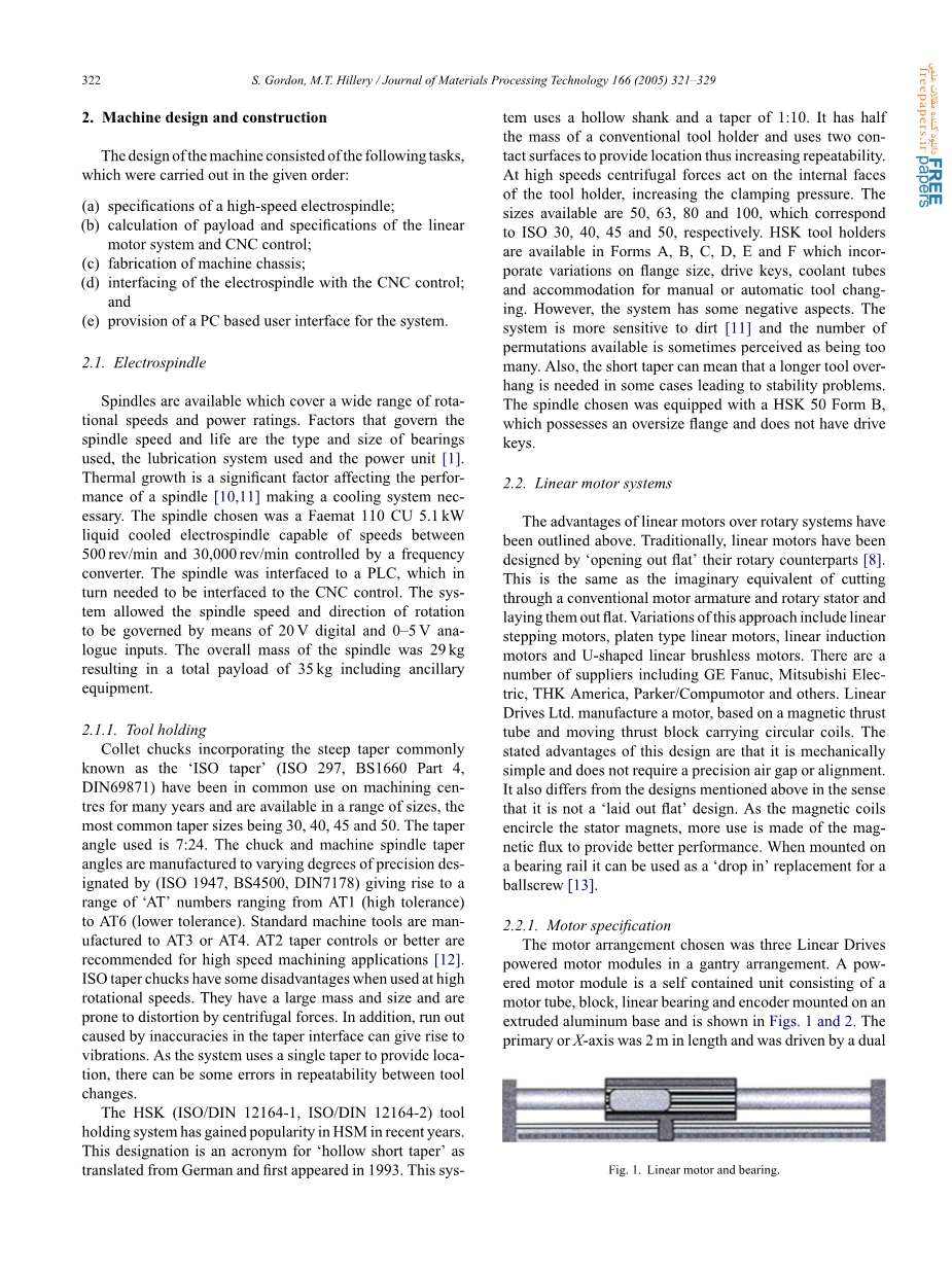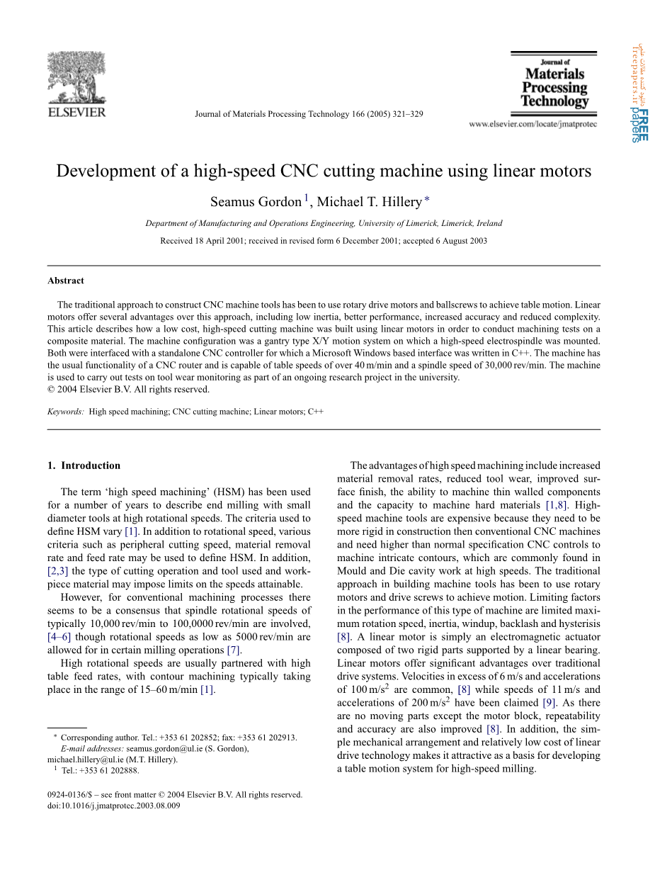 摘要: 构造数控机床的传统方法是使用旋转驱动电机和滚珠丝杠来实现工作台运动。与这种方法相比,直线电机提供了几个优点,包括低惯性,更好的性能,更高的精度和更低的复杂性。本文介绍了如何使用线性电机构建低成本高速切割机,以便对复合材料进行加工测试。机器配置是龙门式X/Y运动系统,其上安装了高速电主轴。两者都与一个独立的CNC控制器接口,其中基于Microsoft Windows的界面是用C 编写的。该机器具有CNC路由器的常用功能,工作台速度超过40m/min,主轴转速可达30,000r/min。这台机器被用来进行工具磨损监测测试,作为大学正在进行的研究项目的一部分。