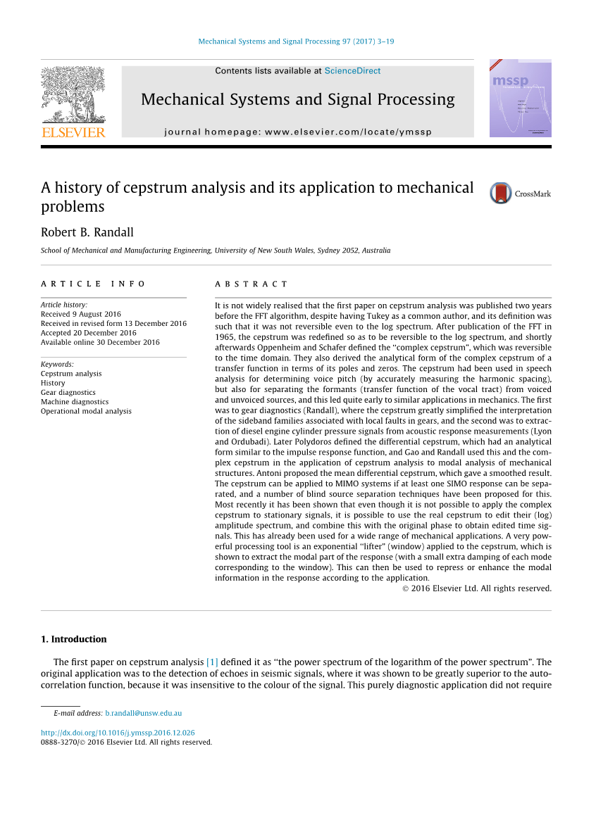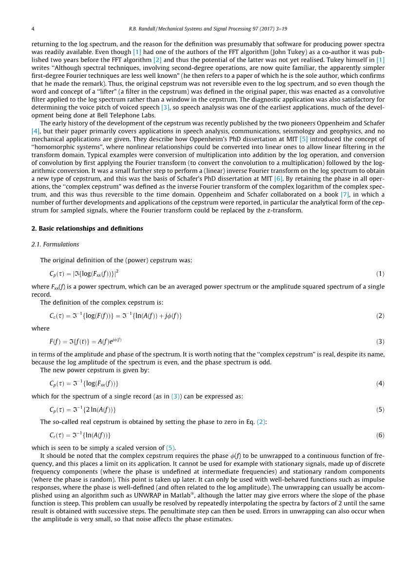 在FFT算法之前,大部分人并不知道《倒谱分析》的第一篇论文已经发布了两年,Tukey已经给出了一个广义的结论,即使是在对数谱上,倒频谱的定义也不可逆。在1965年FFT发表之后,倒频谱被重新定义,使其能够对对数谱进行可逆处理,并且不久之后,Oppenheim 和 Schafer定义了“复倒谱”,在时间域,它是可逆的。他们还推导出了一种传递函数在极点和零点的解析形式。在语音分析中,《倒谱仪》被用于确定声音音高(通过准确测量谐波间距),同时也用于区分声音的共振峰(声道的传递函数)和浊音声源,这在力学上很早就有类似的应用。第一个是齿轮诊断法(Randall),在那里,倒频谱极大地简化了齿轮中与局部故障有关的边缘能量的解释,二是利用声波响应测量提取柴油机气缸压力信号(Lyon和Ordubadi)。后来,Polydoro定义了差分倒谱,它具有类似于脉冲响应函数的解析形式,Gao and Randall利用这种复倒谱,将其应用于机械结构的模态分析。Antoni提出了平均微分倒谱,并给出了一个平稳的结论。如果至少有一个SIMO响应可以分离,则可以将倒频谱应用于MIMO系统,并为此提出了一系列盲源分离技术。最近的研究表明,即使不可能将复倒谱应用于稳态信号,也有可能使用实倒谱来处理它们的(对数)振幅谱,并将其与原相位相结合,以获得经过处理的时间信号。这已经被广泛应用于机械领域。一个有力的指数级别处理工具“频谱滤波器”(窗口模式)可应用于倒谱,能提取出响应的模态信号(与每个窗口模式对应的一个小的额外阻尼)。然后可以根据应用程序对响应中的模态信号进行缩放或增强。