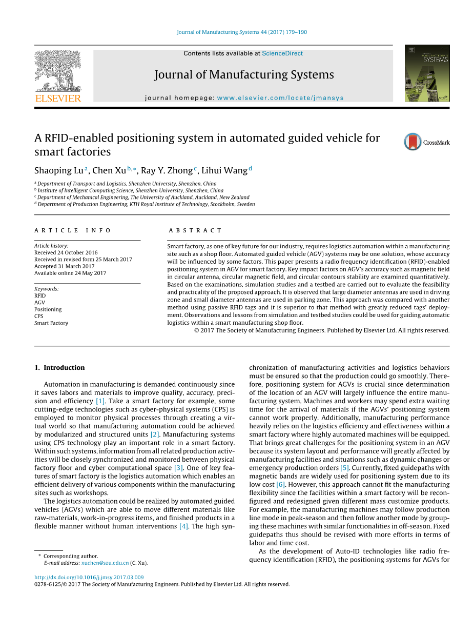 摘要:智能工厂作为我们行业的一个重要的未来,要求在一个生产基地实现车间的物流自动化。自动导向车辆(AGV)系统可能是一种解决方案,其准确性将受到某些因素的影响。本文介绍了一种用于智能工厂的无线射频识别(RFID)定位系统。定量地研究了影响AGV精度的关键因素,如圆形天线、圆形磁场、圆形轮廓稳定性等。在此基础上,对该方法的可行性和实用性进行了仿真研究和试验研究。研究表明,大直径天线用于驱动区,小直径天线用于停车区域。这种方法与另一种使用被动RFID标记的方法进行了比较,它优于这种方法,大大减少了标记的部署。通过模拟和试验研究的观察和教训可以用来指导智能制造车间的自动化物流。