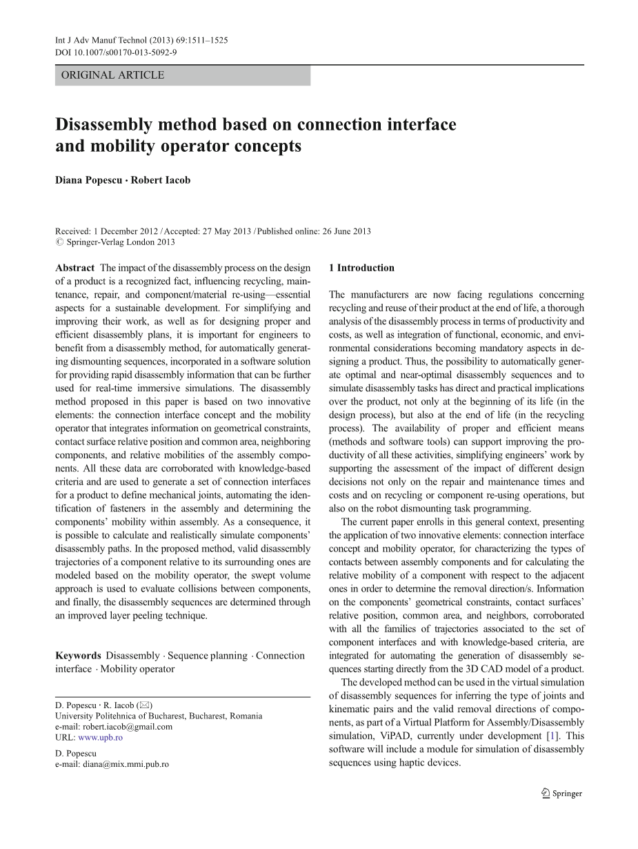 目前的论文参与了这一总体背景,介绍了两个创新元素的应用:连接界面概念和移动算子,用于表征组件之间的接触类型以及计算组件相对于相邻组件的相对移动性确定去除方向。从产品的3D CAD模型开始,有关组件的几何约束,接触表面的相对位置,公共区域和邻居的信息,与所有与该组件接口相关联的轨迹族以及基于知识的标准证实,直接被集成以用于自动生成拆卸。