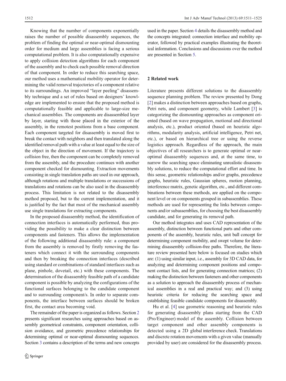 Hu 等人使用几何推理和启发式规则从装配的CAD(Pro / Engineer)模型开始生成拆卸计划。 使用2D全局干涉检查检测目标组件和其他装配组件之间的碰撞。 对于反汇编过程,加入了具有给定值的翻译和离散旋转运动(由用户手动提供)。