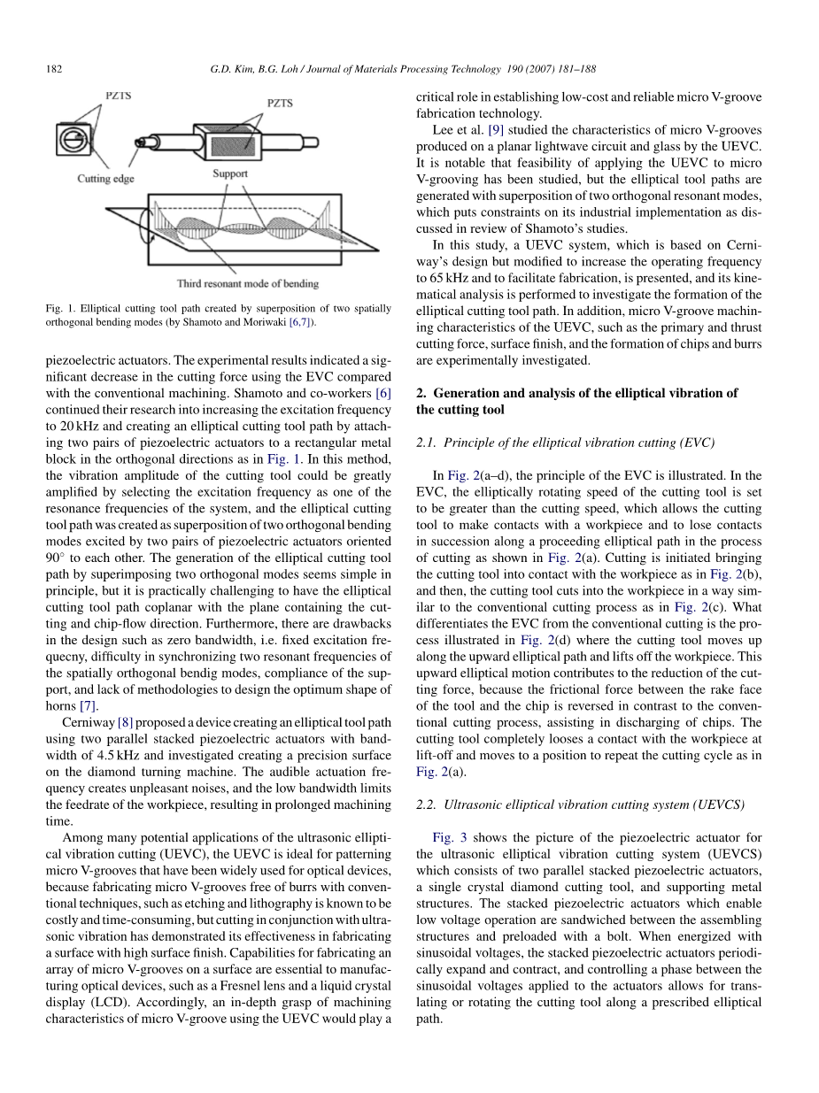 Shamoto和Moriwaki [5]提出了一种新的振动切割方法,称为“椭圆振动切割(EVC)”,其中切割工具连接到压电致动器。当通过压电致动器致动切割工具时与工件接触,切割工具的椭圆路径由两个正交组装的压电致动器产生。实验结果表明使用传统机械加工的切削力显着下降。Shamoto及其同事[6]继续他们的研究,将激发频率提高到20 kHz,并通过将两对压电致动器连接到正交方向上的矩形金属块,形成一个椭圆形刀具路径,如图1所示。在该方法中,通过选择激励频率作为系统的一个频率,可以放大激励频率的振动幅度,并且椭圆形切割工具路径被创建为由两对压电激励的两个正交弯曲模式的叠加,致动器彼此相向90°。椭圆形刀具路径中的椭圆形刀具路径与椭圆形刀具路径相同。另外,设计中还存在诸如零带宽,固定激励频率,两个正交弯曲模式同步困难以及缺乏设计角[7]的最佳形状的方法的缺陷。
