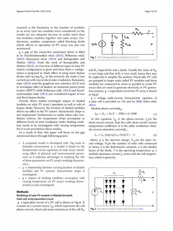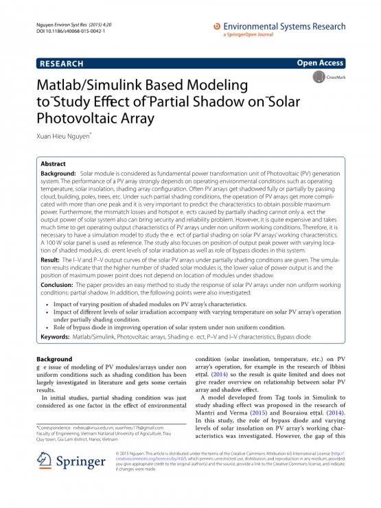 在早先的研究中,局部阴影情况只是作为光伏电池阵列环境影响(曝晒,温度等)的一个因素,例如在Ibbinietal .(2014)的研究中,得出的结果有相当大的局限性,不能给读者一个光伏电池阵列和阴影影响关系的一个综述。