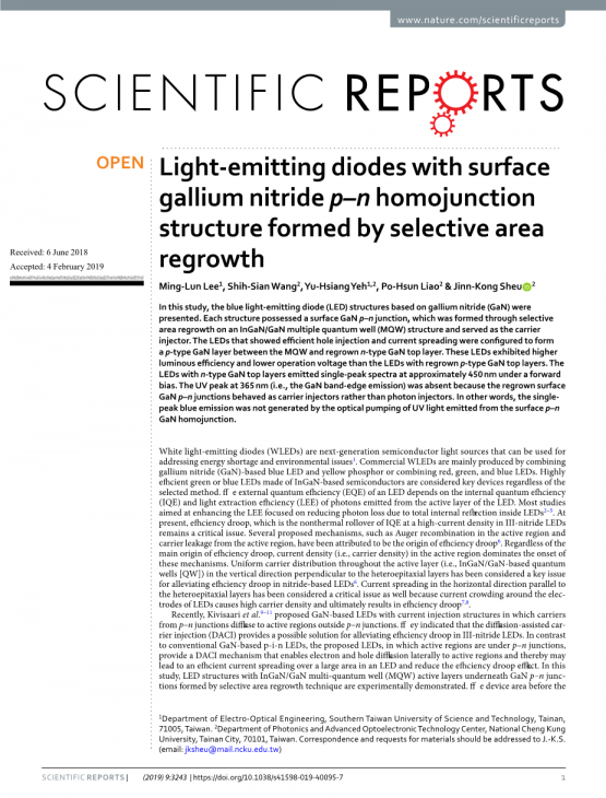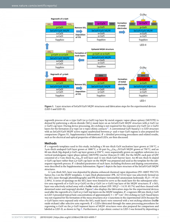 最近,Kivisaari等。9,10,11提出GaN-based led电流注入结构运营商pn连接分散的活跃区域pn连接。 他们表明,diffusion-assisted载体注入(DACI)提供了一个可能的解决方案来缓解III-nitride led的效率降低。 相比传统GaN-based p i n发光二极管,该发光二极管,在活跃的地区pn连接,提供一种DACI机制,使电子和空穴扩散横向活跃地区,从而可能导致一个有效电流在LED大面积蔓延,减少效率下垂的效果。 在这项研究中,使结构与InGaN /氮化镓multi-quantum甘(发光)活性层下面pn连接由选择性区域再生技术实验。 前的设备区域再生一个的过程n甘类型(或p-GaN)顶层的有机气相外延(MOVPE)由模式定义一个二氧化硅(SiO2)掩模层InGaN /氮化镓发光结构p氮化镓(或ngan)盖层。 在设备加工、干蚀刻的暴露不是必需的p氮化镓(或n氮化镓层的形成p类型(或n类型)欧姆接触12。 传统GaN-based p i n领导结构InGaN /氮化镓发光夹在活跃区域p- - -n甘类型地区也准备比较(图。S1、补充信息)。 详细的处理程序和相关的结果,如制造发光二极管的电子和光学性质,然后讨论。