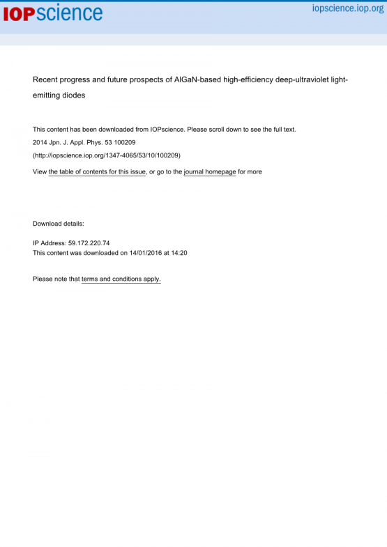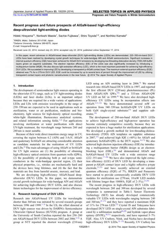 IQE(gt;60%)通过引入多量子势垒(mqb)设计作为电子阻挡层(ebl),实现了高电子注入效率(eie)并演示了具有宽发射范围(222-351 nm)的基于Algan和Inalgan的紫外发光二极管。我们还通过开发一种跨母体提高了duv的光外效率(lee)。p-algan接触层和高度反射的p型电极,最近实现了7%的外部量子效率(eqe)。Riken和松下已经开始提供商用的消毒用Duv LED模块(270nm,10mW,寿命超过10000h,eqe为2–3%)。