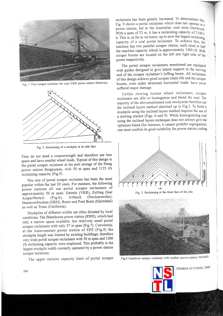 这样的机器于1 991年安装在VEW电站Weme上,其跨度为50 m,回收能力为1150 t / h(图17)。除了较早的桥接回收器之外,还安装了它。现在,煤炭堆场有能力通过多种选择的阻遏性煤炭来实现良好的均质化和一致的混合,这些煤炭的质量和数量通常可能会有所不同。